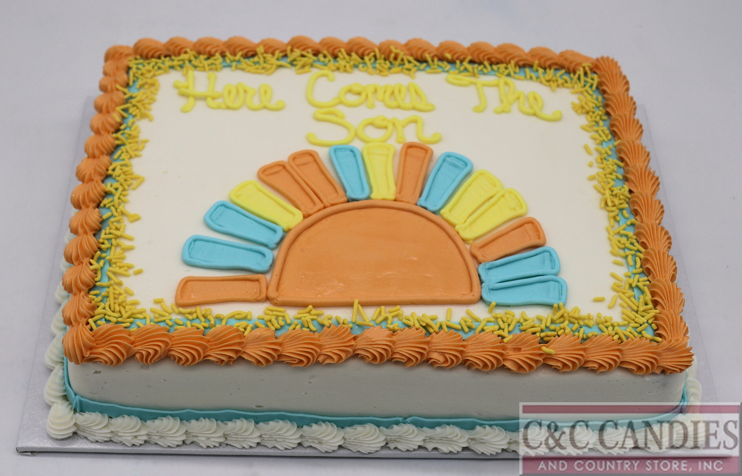 Brighten up your baby shower celebration with our Here Comes the Son Baby Shower Cake! This cheerful sheet cake features a hand-piped, retro-style sunburst design in warm orange, yellow, and blue tones, with playful sprinkles and soft buttercream borders. The sunny message and vibrant palette make it a perfect choice for welcoming a little boy, gender-neutral showers, or simply spreading joy. Customize with your preferred cake flavor: chocolate, yellow, white, banana, red velvet, carrot, or confetti. Each cake is made fresh with our signature buttercream for a delicious and eye-catching treat.