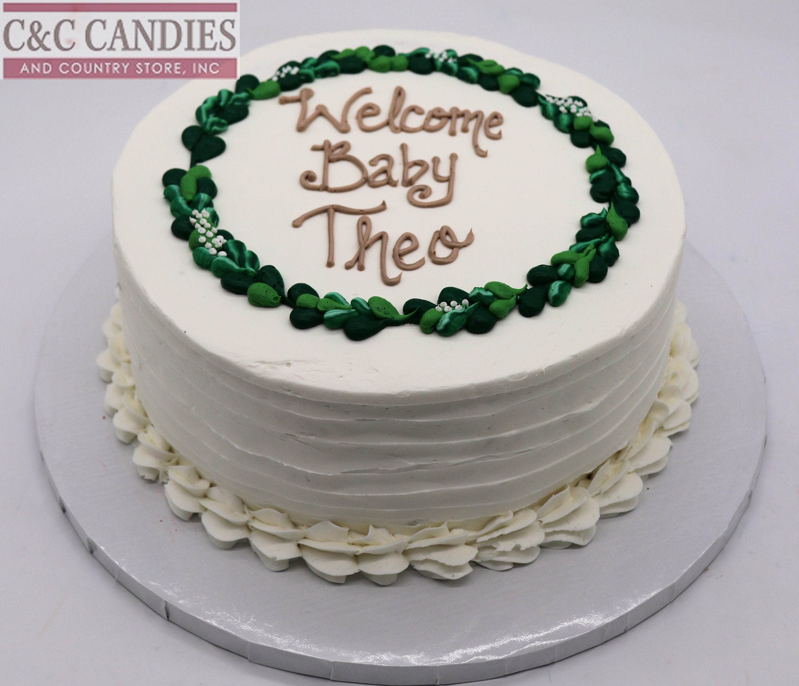 Elegant and timeless, our Simple & Sweet Baby Wreath Cake is the perfect way to welcome a new arrival. This round cake features smooth icing with a delicate wreath of hand-piped greenery and floral accents surrounding your custom message. Ideal for baby showers, gender reveals, or naming celebrations, this design offers a minimalist, nature-inspired look that can be personalized in any color scheme. Choose from delicious cake flavors including chocolate, yellow, white, banana, red velvet, carrot, or confetti. Freshly made to order and finished with our signature buttercream.