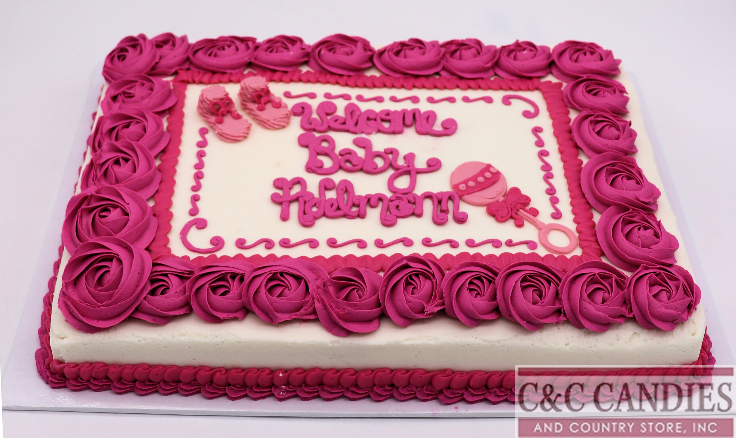 Welcome your newest little love with our Sweet Beginnings Baby Shower Cake! This elegant sheet cake is adorned with large rosette borders, dainty piped details, and baby-themed accents like a rattle and booties—all in beautifully coordinated colors. Whether you choose pink, blue, or a neutral palette, this design adds a heartfelt touch to any baby shower or gender reveal celebration. Available in your choice of flavors including chocolate, yellow, white, banana, red velvet, carrot, and confetti. Each cake is frosted with our signature buttercream and made fresh to order for your special event.