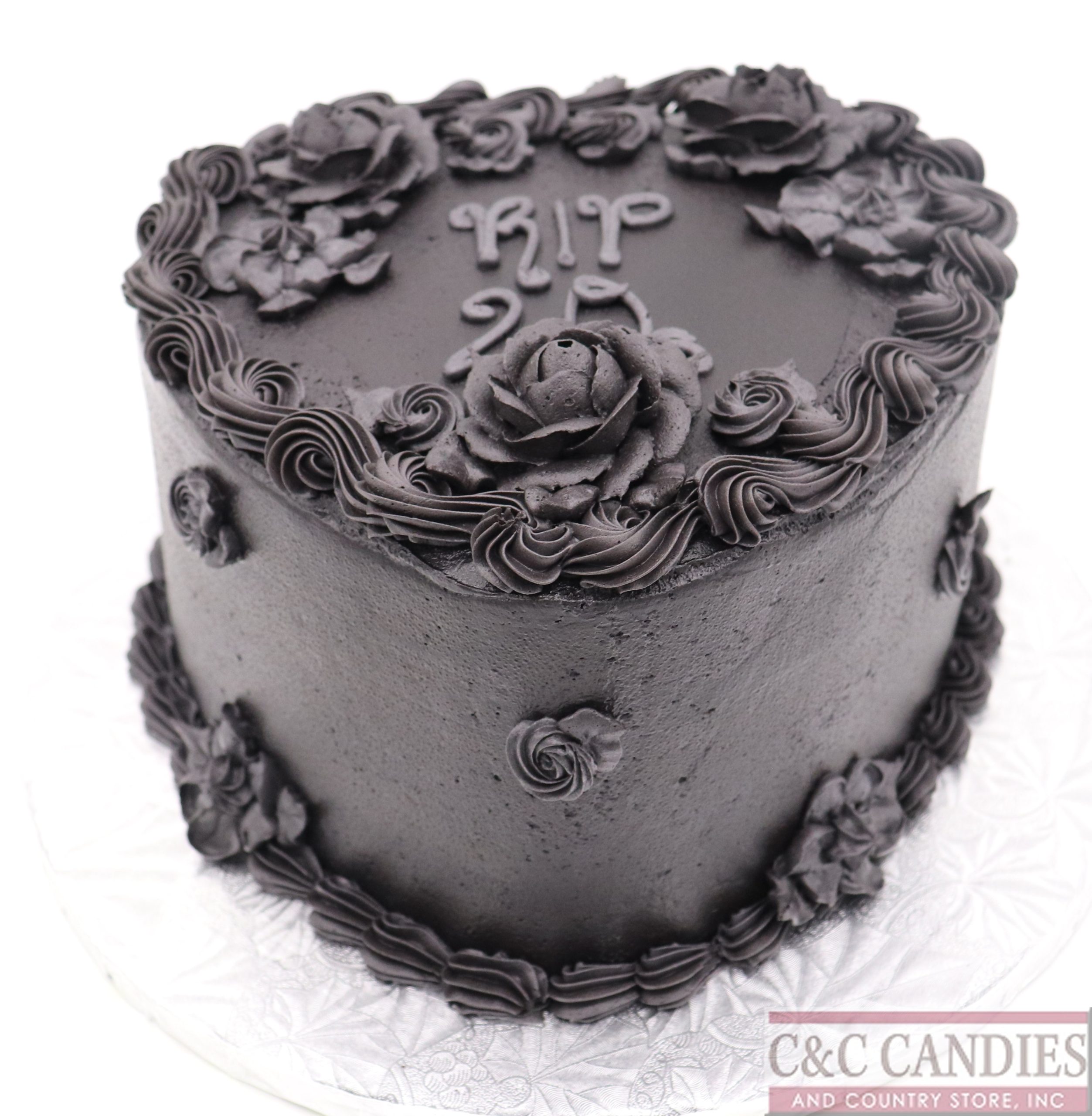 Say goodbye to your roaring twenties in dramatic fashion with our RIP 20s Cake. This bold, heart-shaped cake is frosted in striking black buttercream and adorned with elaborate piped roses and scrollwork. Featuring the phrase “RIP 20s” on top, it’s the perfect sweet sendoff for a 30th birthday with a gothic, glam, or darkly humorous twist.