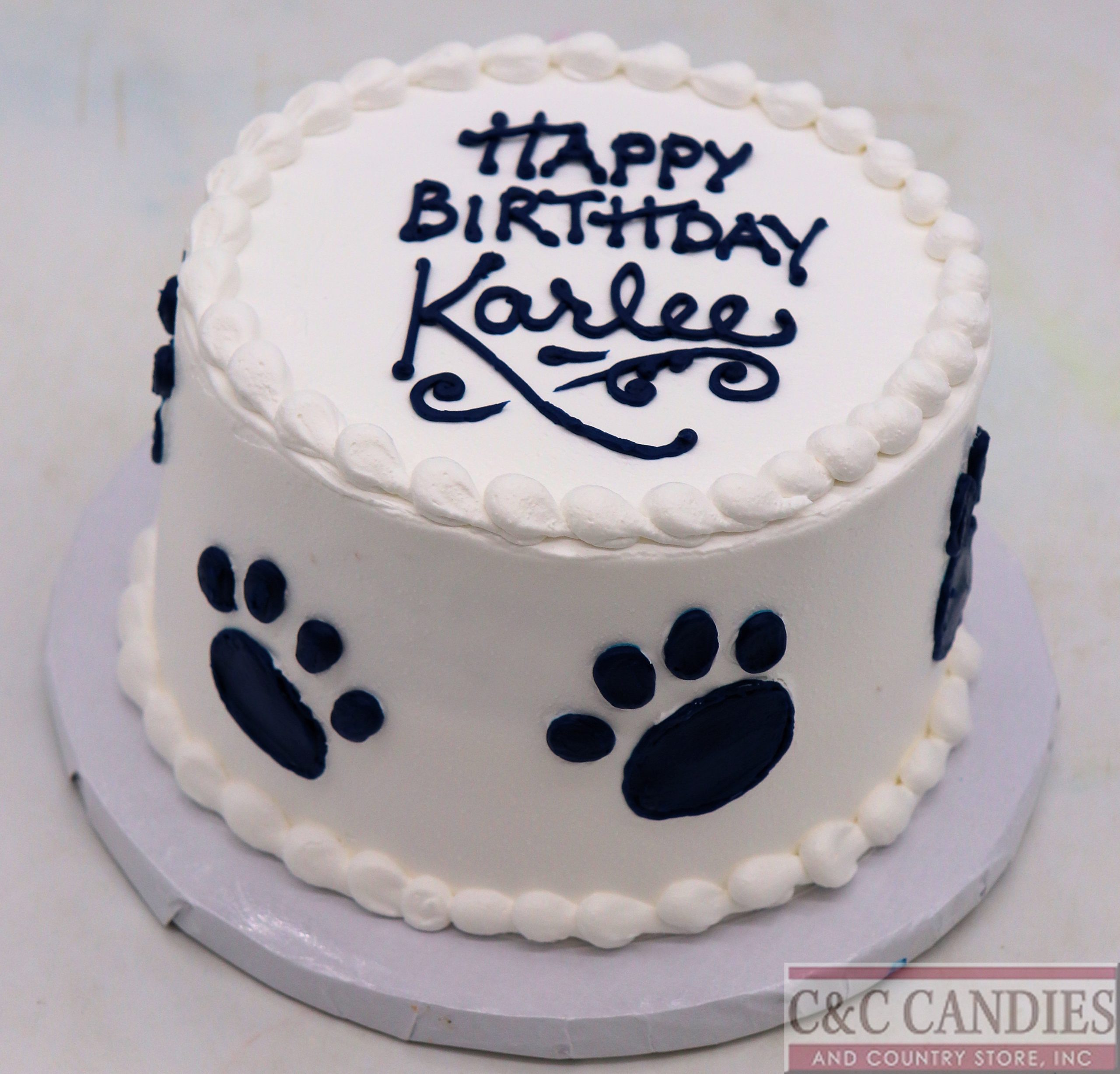 This elegant cake features smooth white buttercream with bold blue paw print accents wrapped around the sides for a sporty, spirited look. The top is finished with a traditional buttercream border and personalized message in coordinating blue script, making it perfect for birthdays, graduations, tailgates, and proud fans of blue and white.