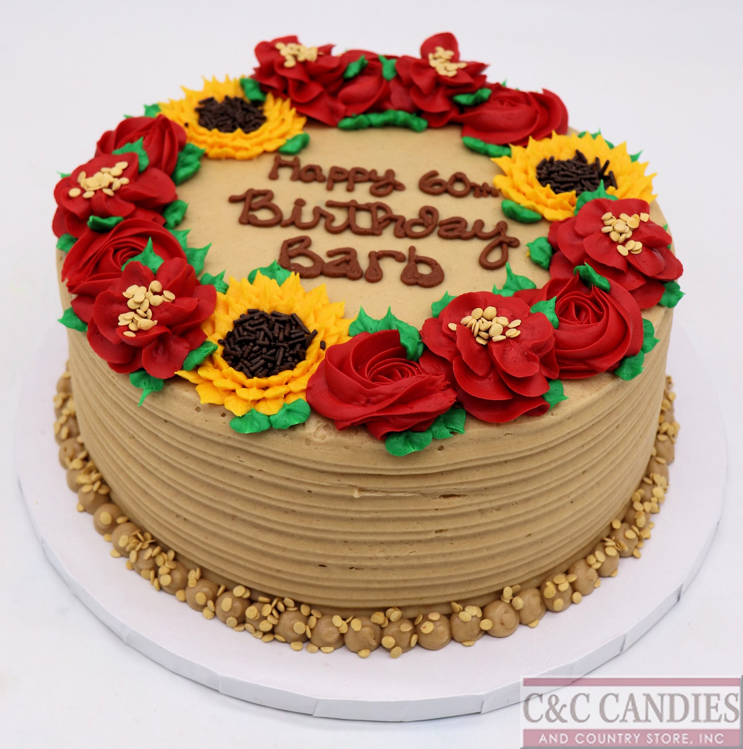 Bold and beautiful, our Sunflowers & Scarlet Blooms Cake is perfect for milestone birthdays and special celebrations! This round cake features a stunning mix of hand-piped bright yellow sunflowers with chocolate sprinkle centers and deep red buttercream roses, all set against a smooth peanut butter icing base with ridged sides. Finished with piped detailing and sprinkled accents around the base, this floral cake is both eye-catching and delicious. Choose your favorite cake flavor and icing type to make it your own!