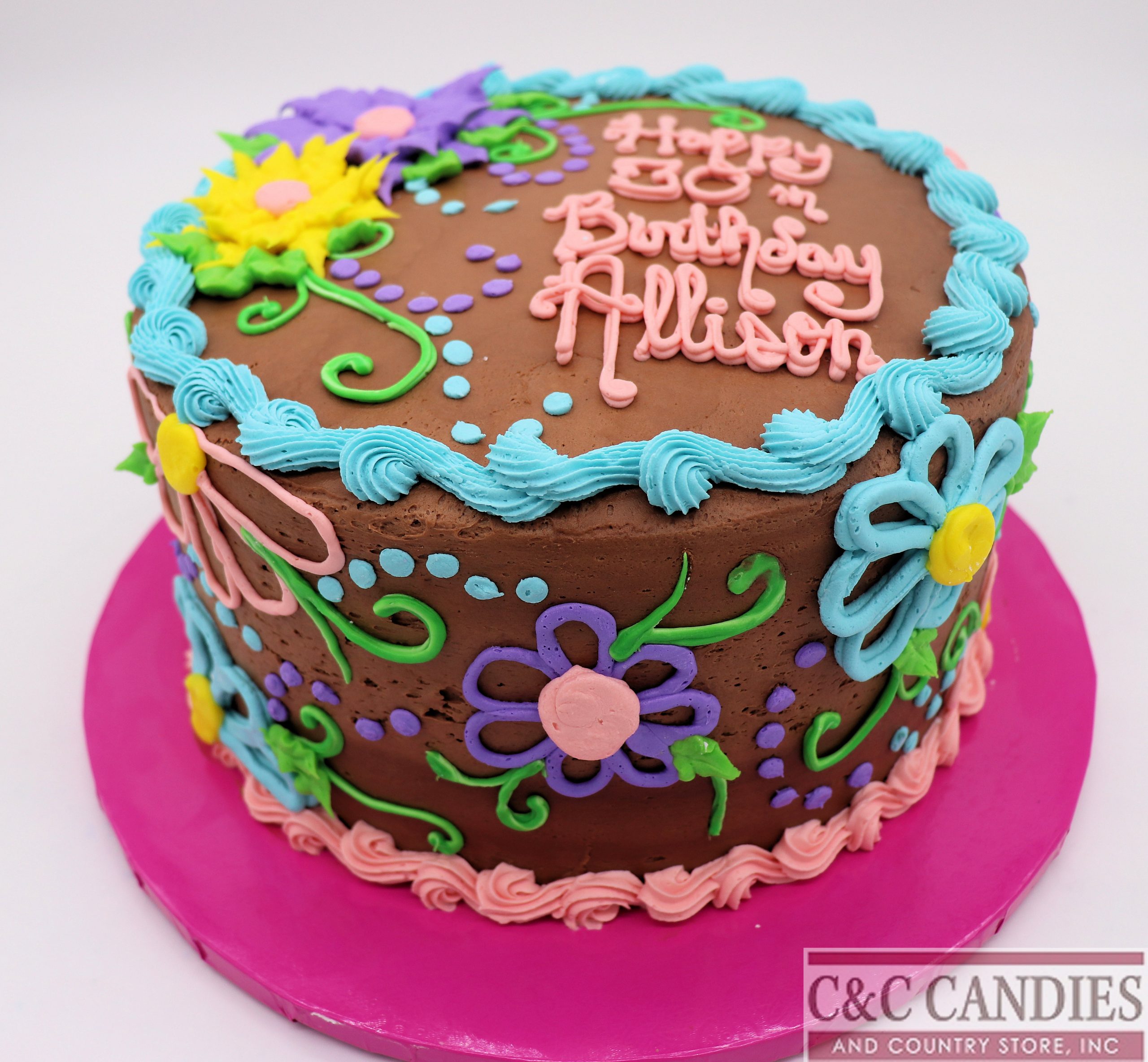 Bright, bold, and full of flower power—our Hippie Chic Cake is a retro-inspired celebration of color and creativity! This playful design features a chocolate icing base (also available in other icings) decorated with hand-piped flowers, swirls, and dots in vibrant pastel tones. With sky-blue trim, floral outlines, and pops of yellow and pink, this cake brings fun, free-spirited energy to any birthday or special occasion.