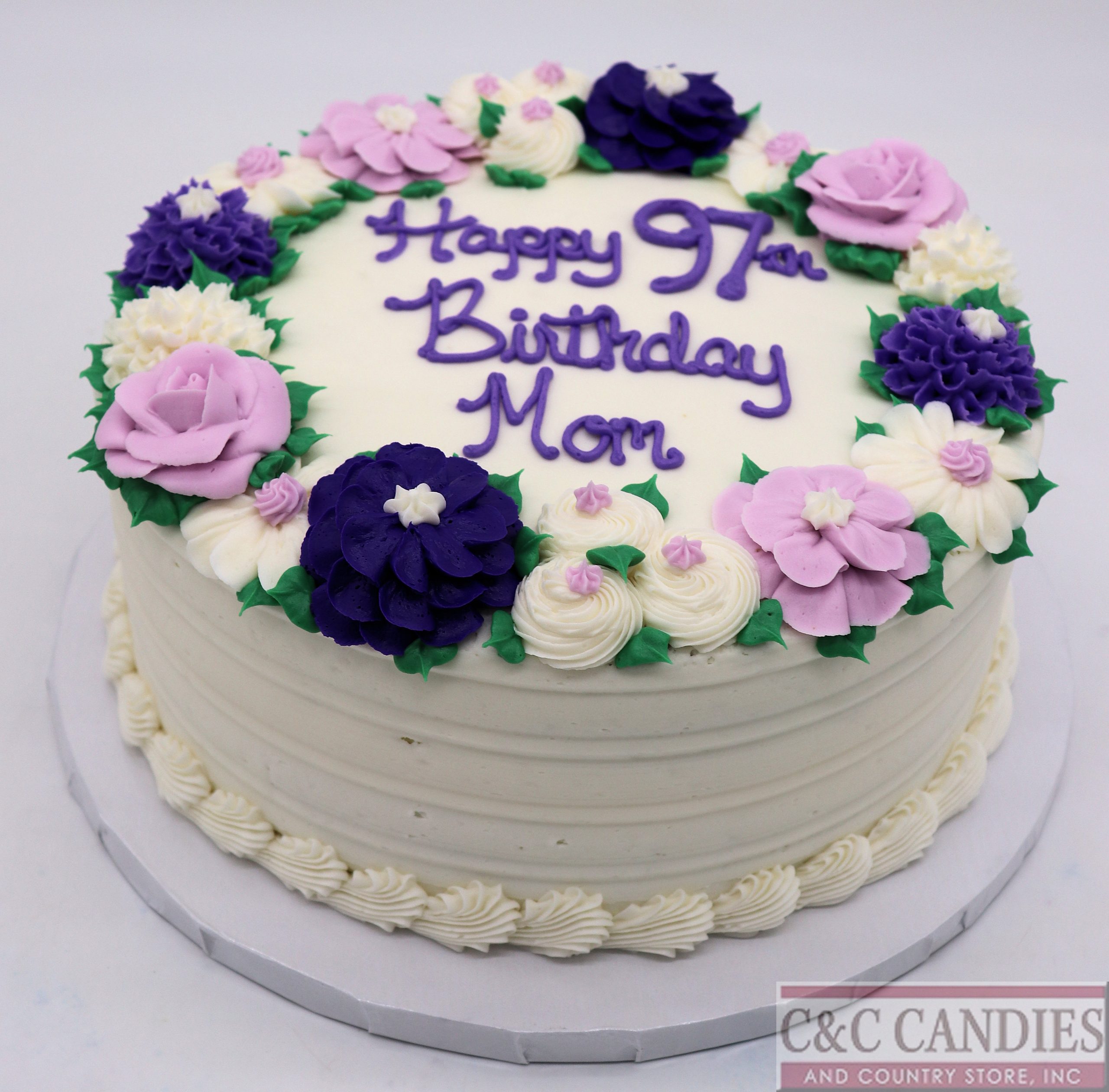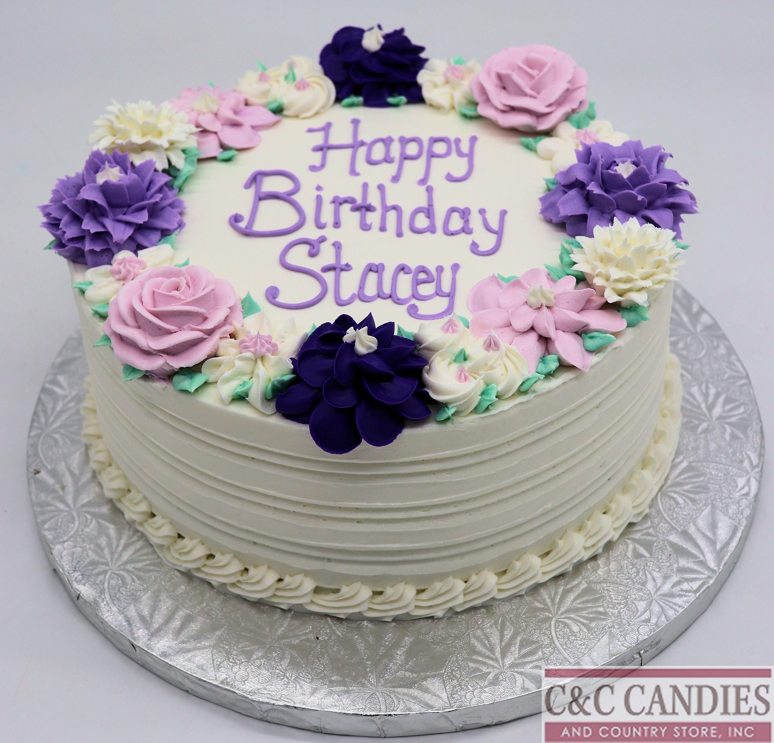 Celebrate life’s most cherished moments with our Lavender Garden Bloom Cake! This elegant round cake is adorned with a stunning ring of hand-piped buttercream flowers in dreamy shades of lavender, lilac, ivory, and deep violet. Featuring delicate roses, dahlias, and rosettes nestled in vibrant green leaves, this floral design is perfect for birthdays, retirements, anniversaries, or just to show someone you care. Customize your message to make it extra personal, and enjoy the beauty and flavor of this timeless design.