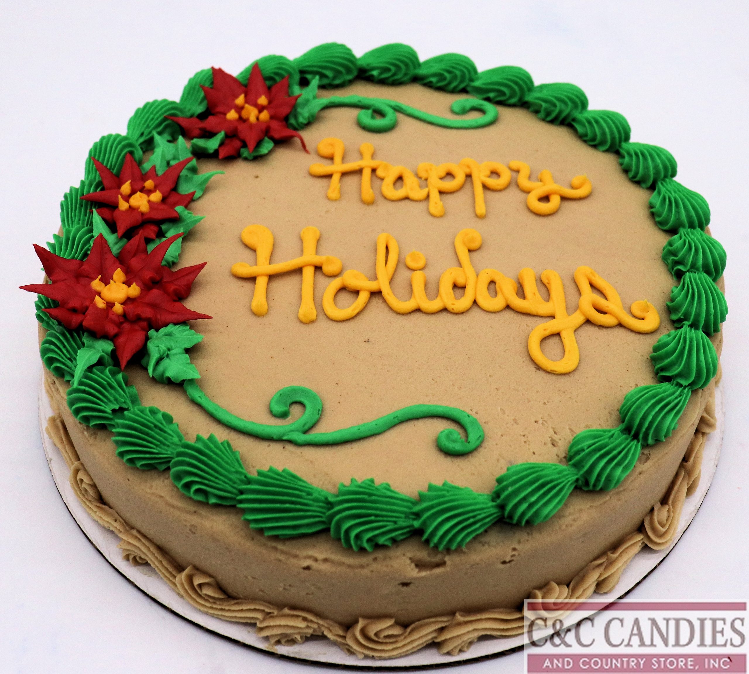 Add holiday cheer to your dessert table with our Poinsettia Round Cake! This festive design features bold red buttercream poinsettias with yellow centers and green leaves, accented by seasonal red, green, and white sprinkles. A piped border adds a classic finish to this smooth, round cake. Available in any icing flavor—buttercream, whip, or peanut butter—this cake is perfect for Christmas celebrations, winter birthdays, or holiday gatherings. Customize it with your own message for a sweet seasonal touch!