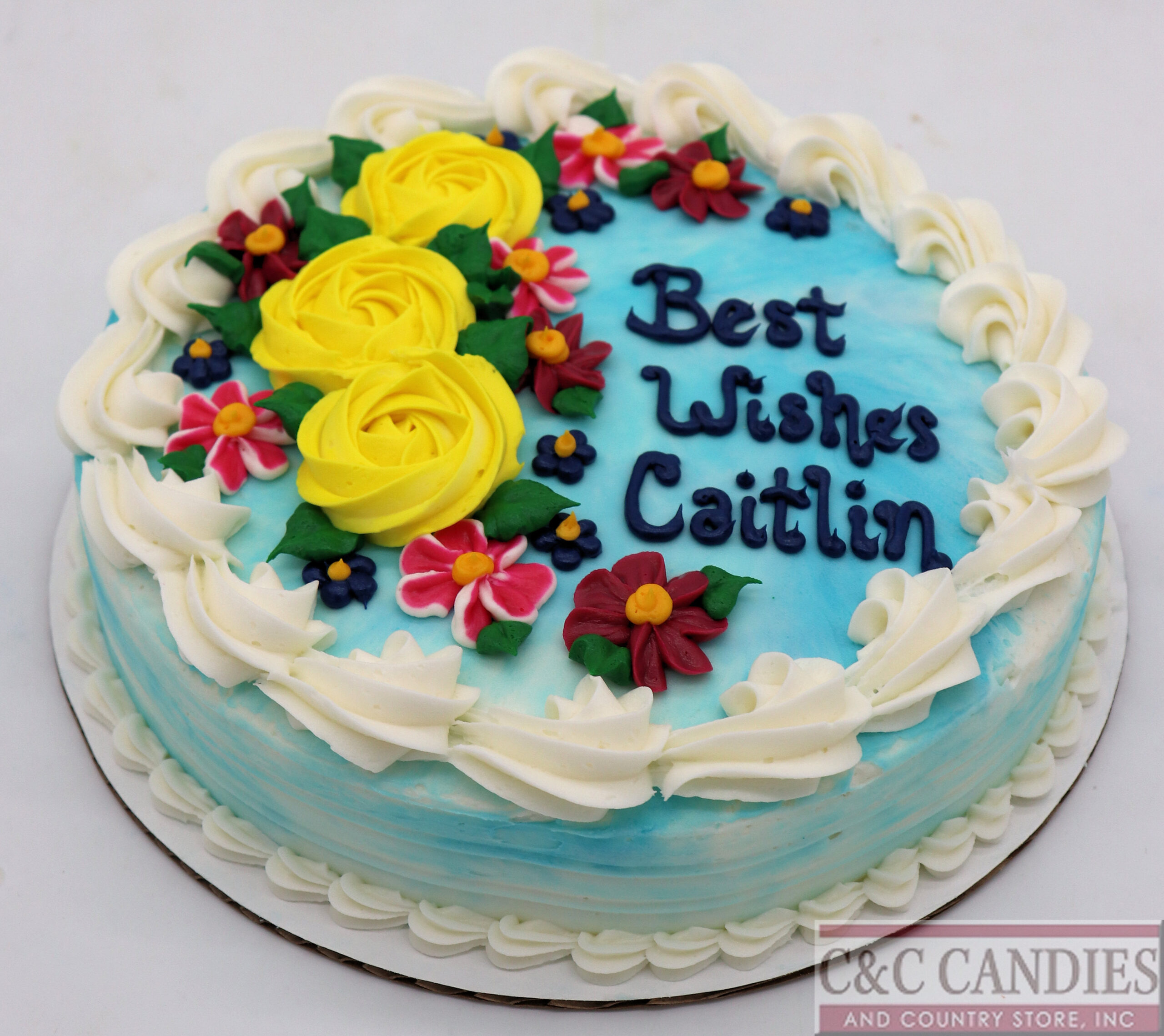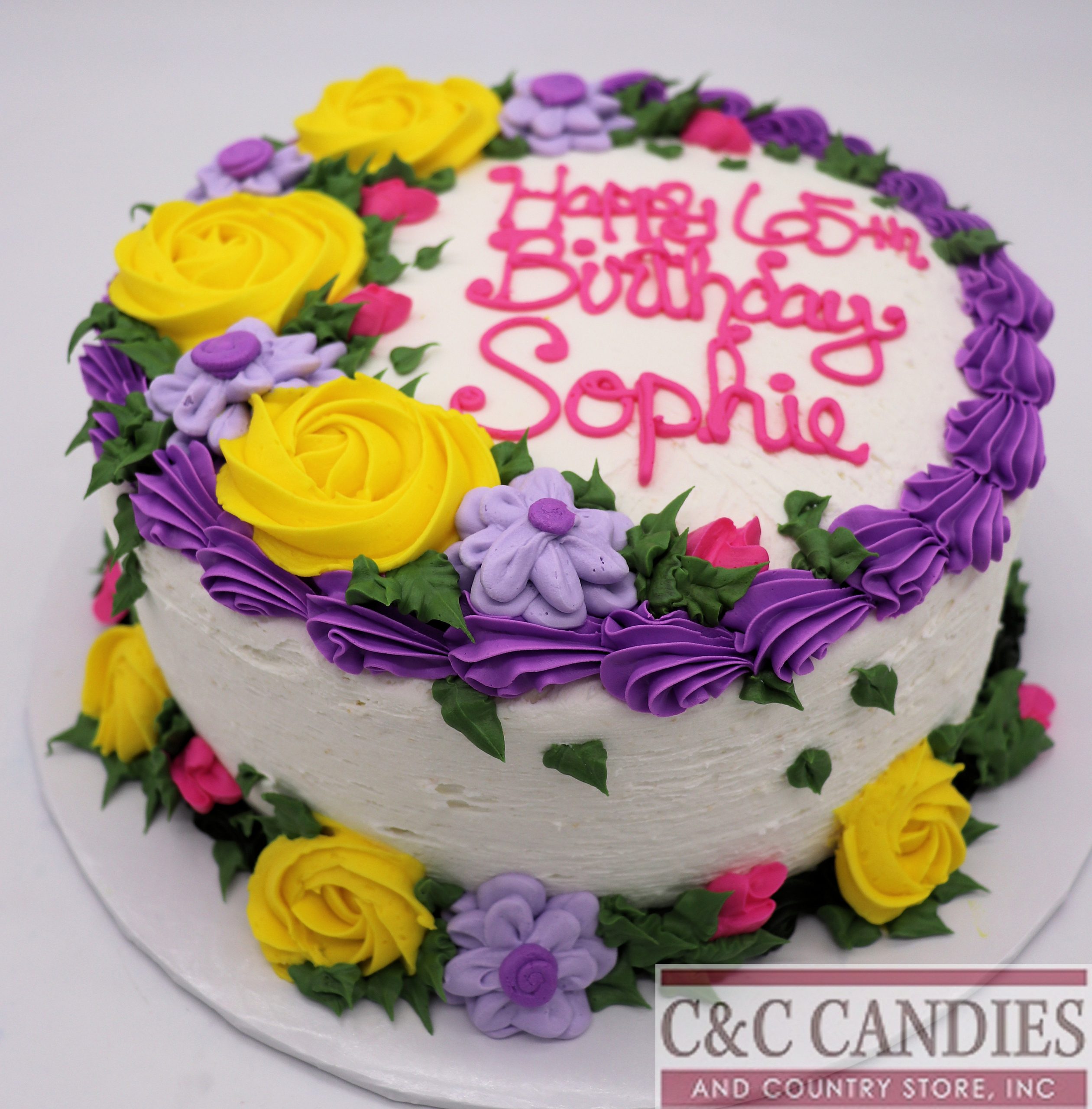 Brighten any celebration with our Sunshine Garden Cake! This joyful design bursts with color, featuring vivid yellow buttercream roses, purple swirls, lilac blossoms, and pink buds, all carefully hand-piped and surrounded by lush green leaves. The cake is finished with a matching floral border and your custom message in a fun, bold script. Whether it’s for a birthday, retirement, or just to spread happiness, this cheerful cake is sure to bring smiles.
