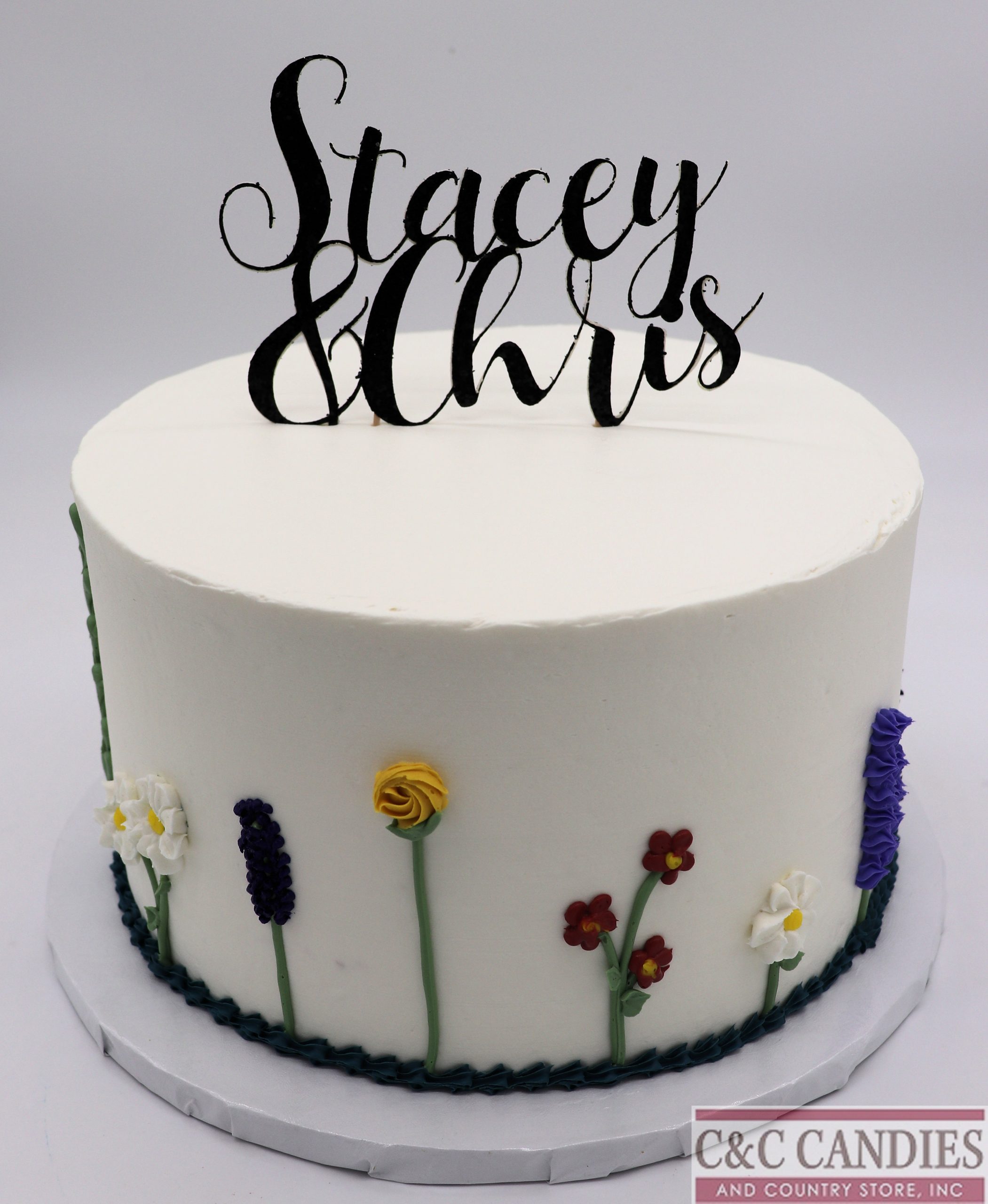 Our Wildflower Fields Cake is a charming and elegant choice for weddings, bridal showers, birthdays, or garden-themed celebrations. This design features a smooth buttercream finish with delicately piped wildflowers wrapping around the base for a soft, rustic look. Perfect for any special occasion, this cake can be personalized with your message or celebration. Topper not included. Available in chocolate, yellow, white, banana, red velvet, carrot, or confetti.