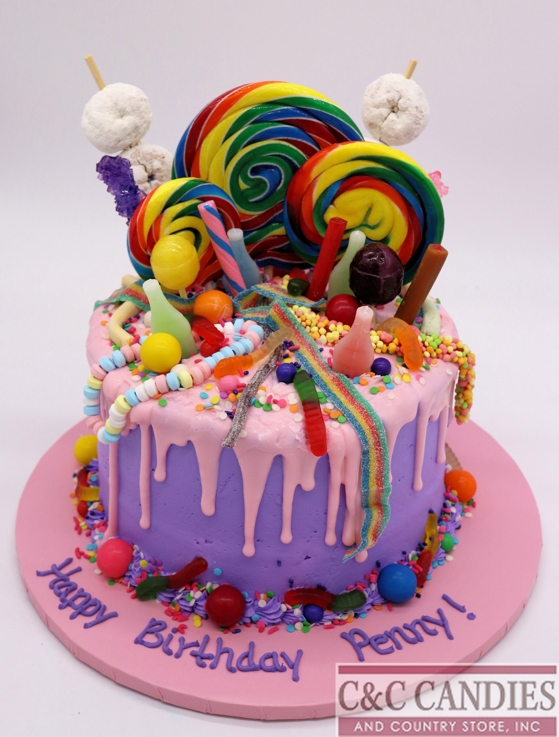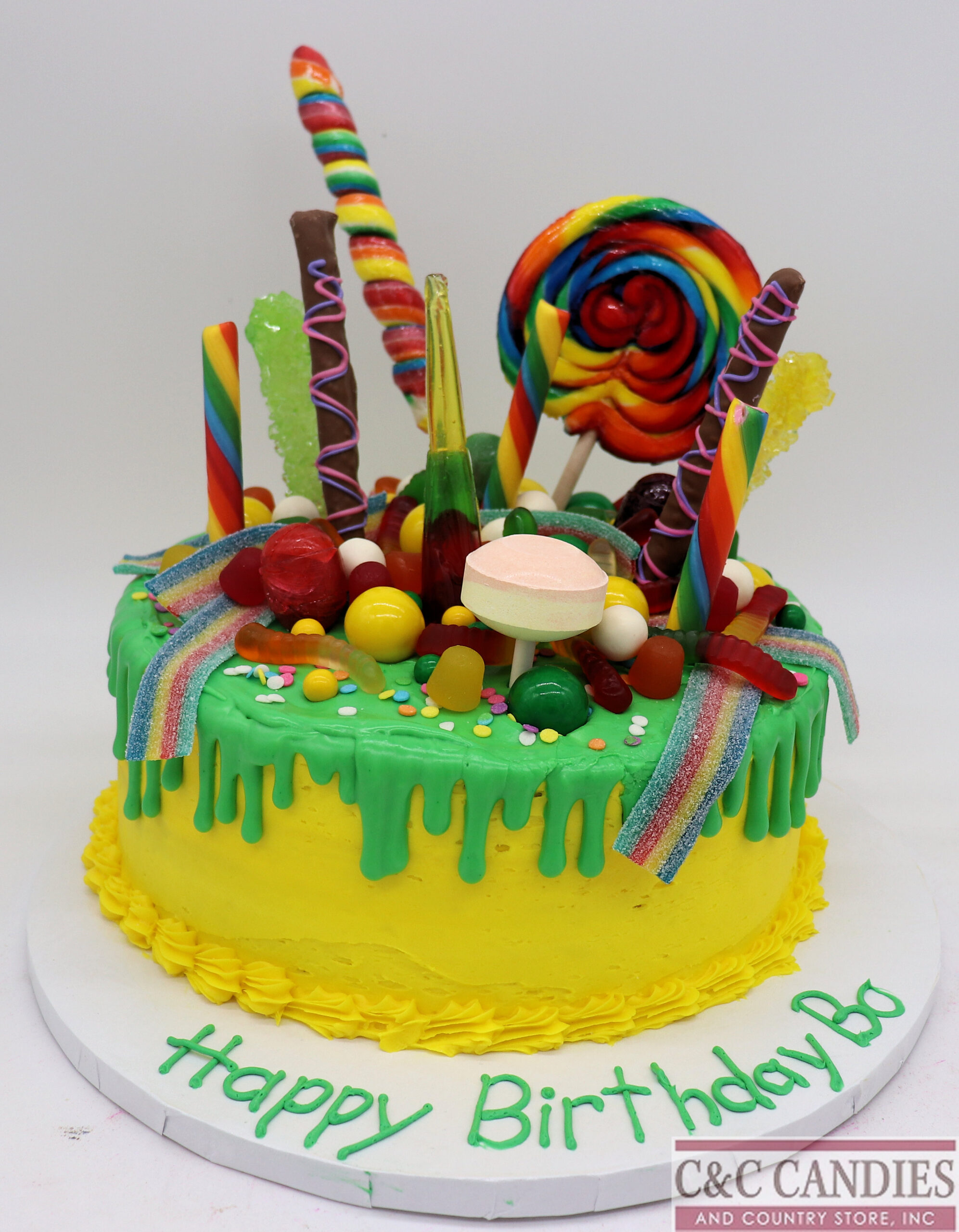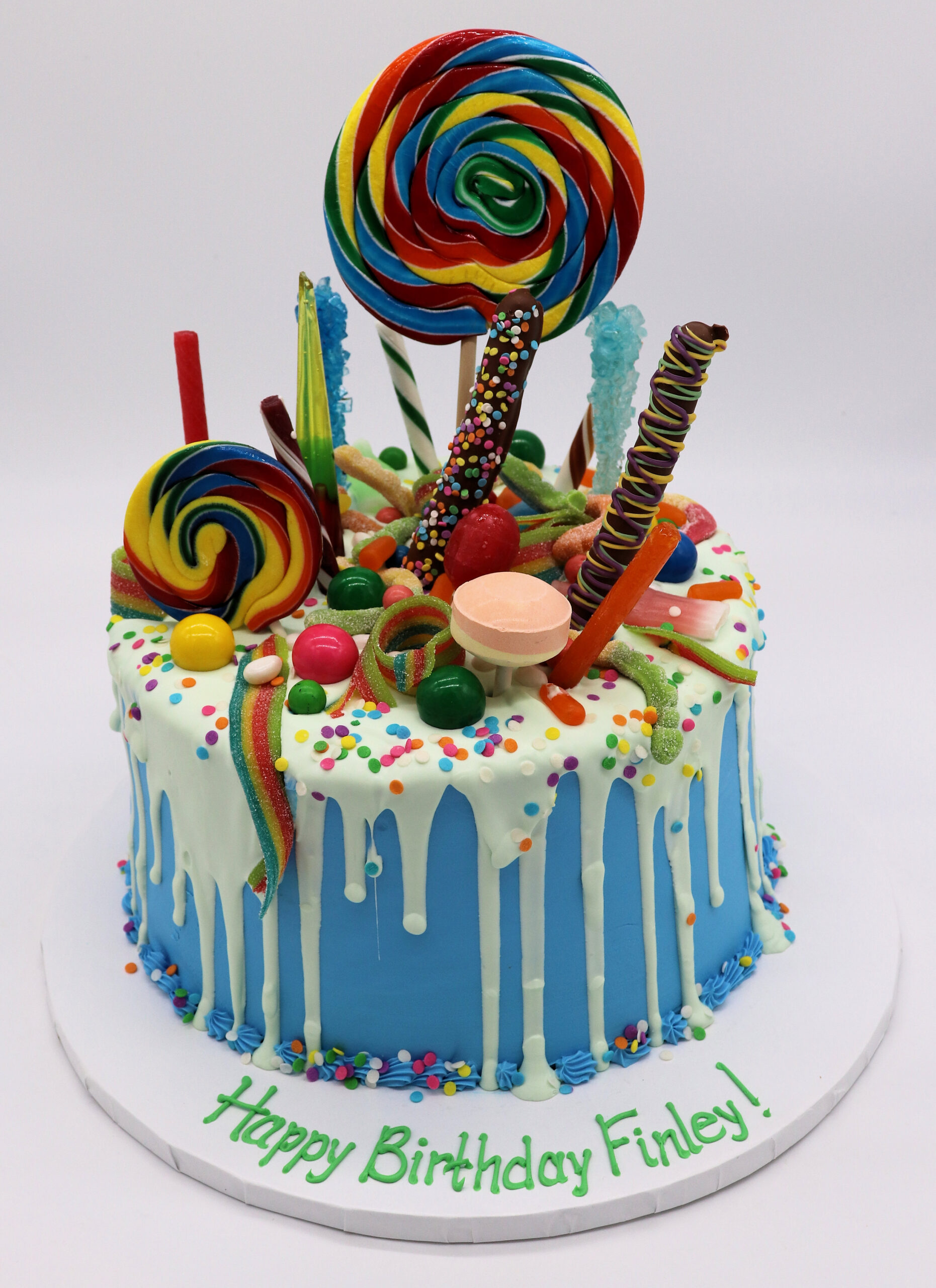 Bring the party to life with our Candy Explosion Drip Cake! This showstopping round cake is piled high with colorful candies, swirled lollipops, rainbow strips, gummy treats, and playful sprinkles—all cascading from a vibrant drip design. Perfect for birthdays, celebrations, or anyone with a serious sweet tooth! Choose your favorite color for the base and enjoy it with rich buttercream icing only.