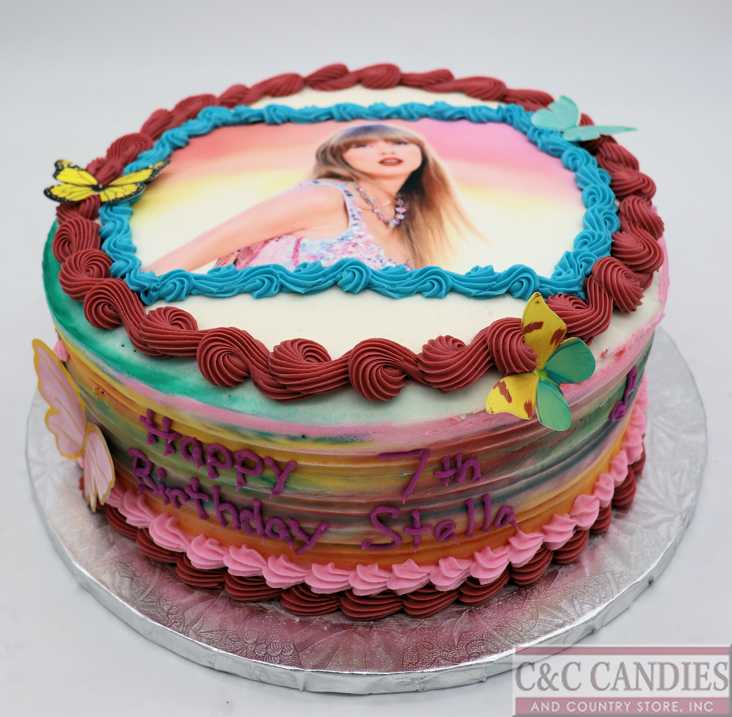 Celebrate your special day with our Lover Era Cake — a dreamy, Taylor Swift-inspired creation available in either a round or heart shape! Featuring vibrant pastel hues, disco balls, butterflies, and an edible image reminiscent of the Lover album, this cake is the ultimate tribute for any Swiftie. Choose from a variety of flavors and icing options to customize your perfect concert-themed dessert. Let your birthday shine as bright as a Taylor Swift tour night!