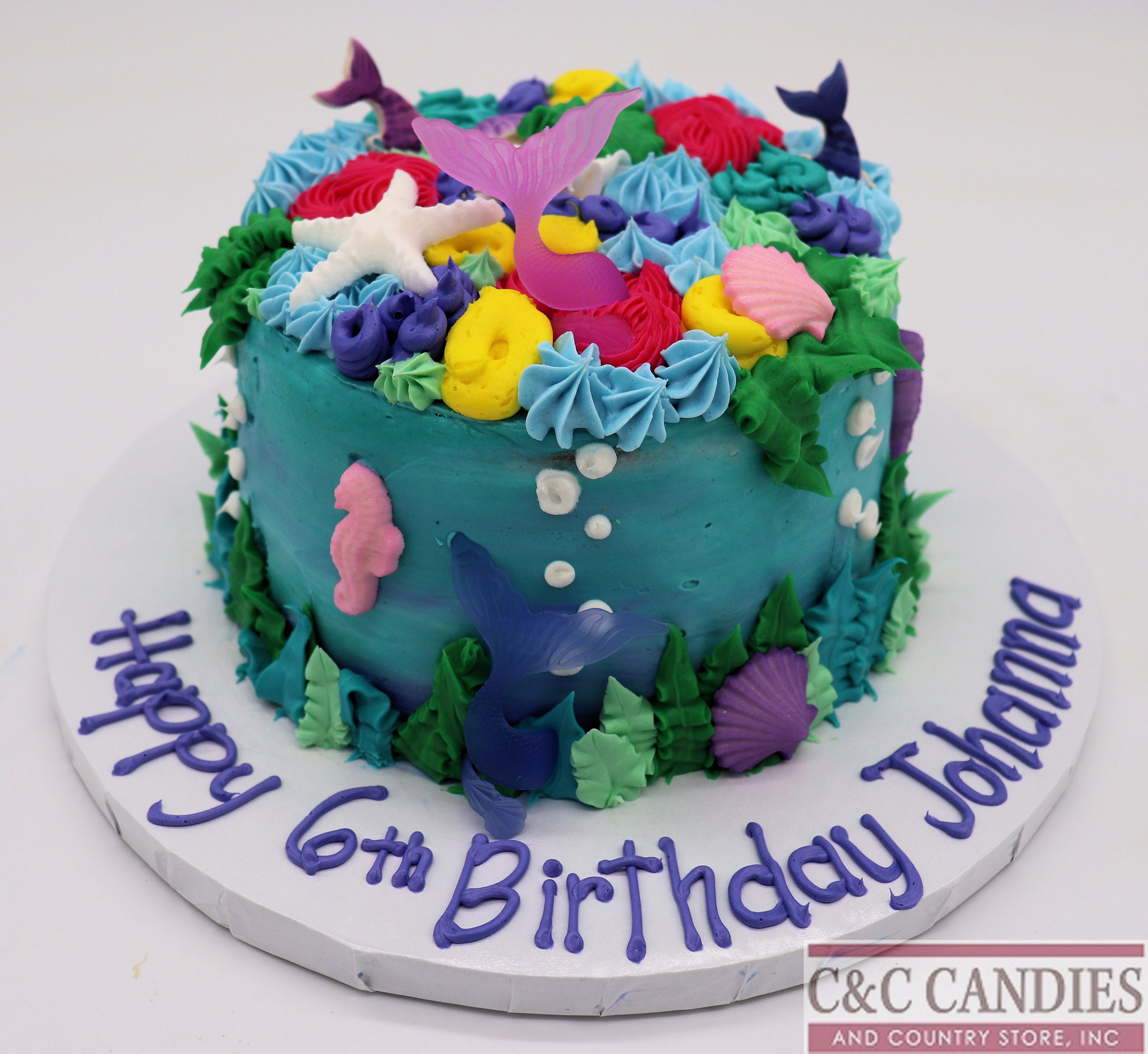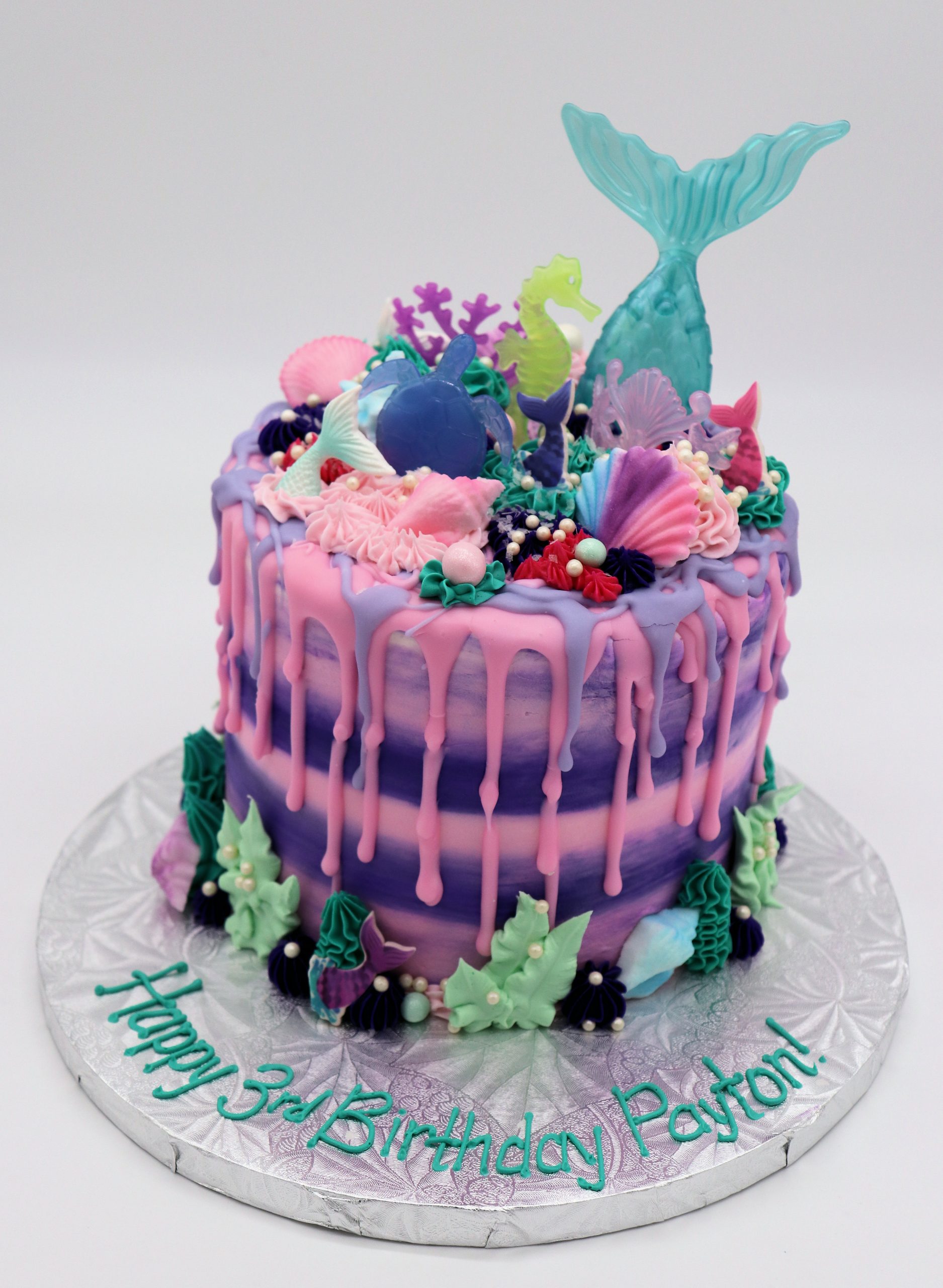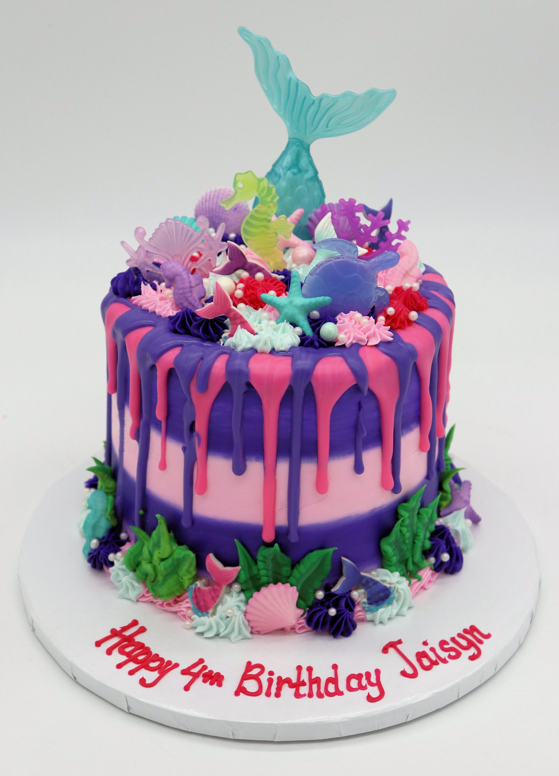 Make waves at your next celebration with our Under the Sea Splash Cake! This vibrant round cake is topped with colorful ocean-inspired decorations like mermaid tails, sea turtles, seahorses, shells, and coral—all crafted to bring a magical underwater world to life. With its dreamy purple and pink buttercream drip design, it’s the perfect choice for mermaid parties, beach birthdays, or any ocean-loving celebration. Available in a variety of delicious cake flavors and finished with rich buttercream icing only.