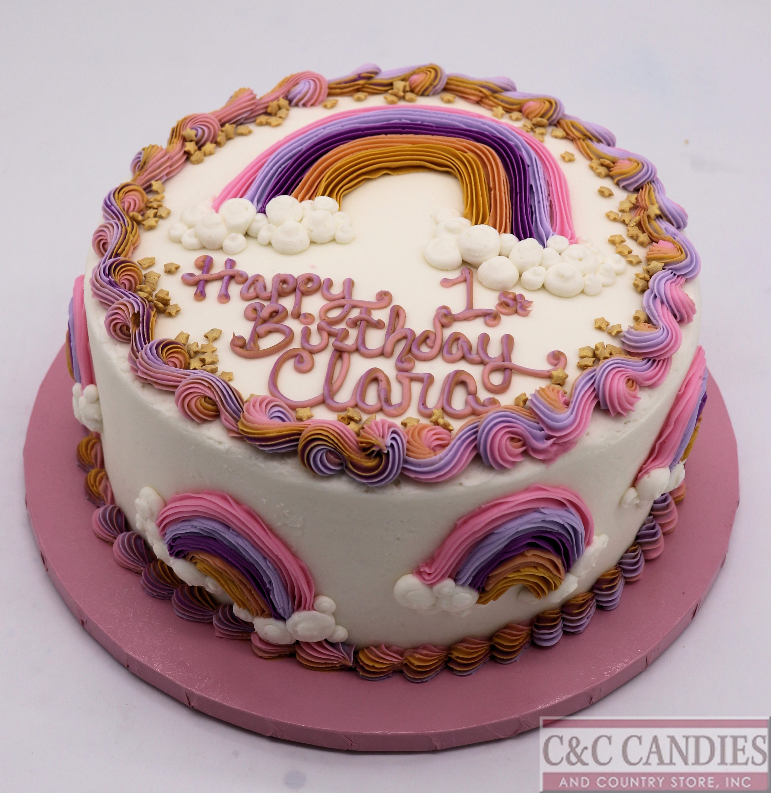 Add a magical touch to your celebration with our Over the Rainbow Cake! This charming round cake features beautifully piped rainbows, fluffy buttercream clouds, and golden star accents. Perfect for birthdays, baby showers, or whimsical parties, this cake is available in your choice of cake flavor and can be frosted with buttercream, chocolate buttercream, peanut butter, or cream cheese icing. (Whipped icing is not available.) In the message to decorator box, please specify if you prefer muted or bright rainbow colors for a personalized design!