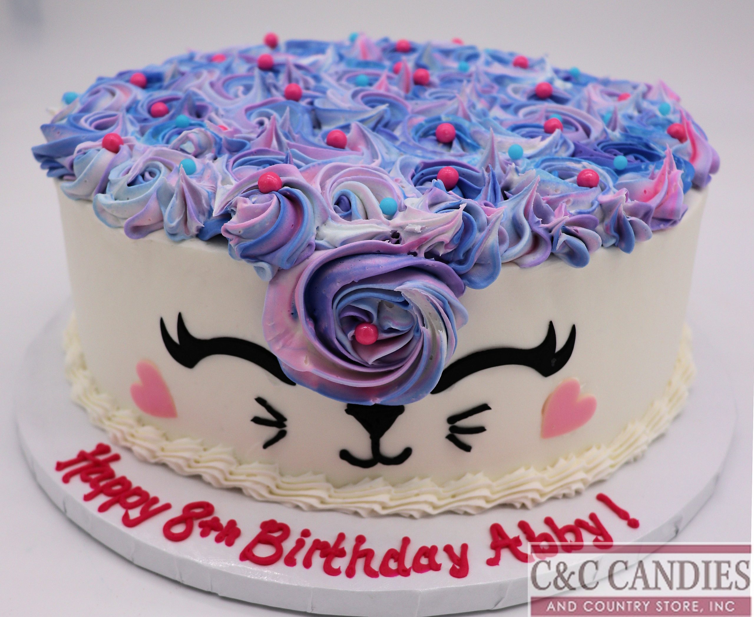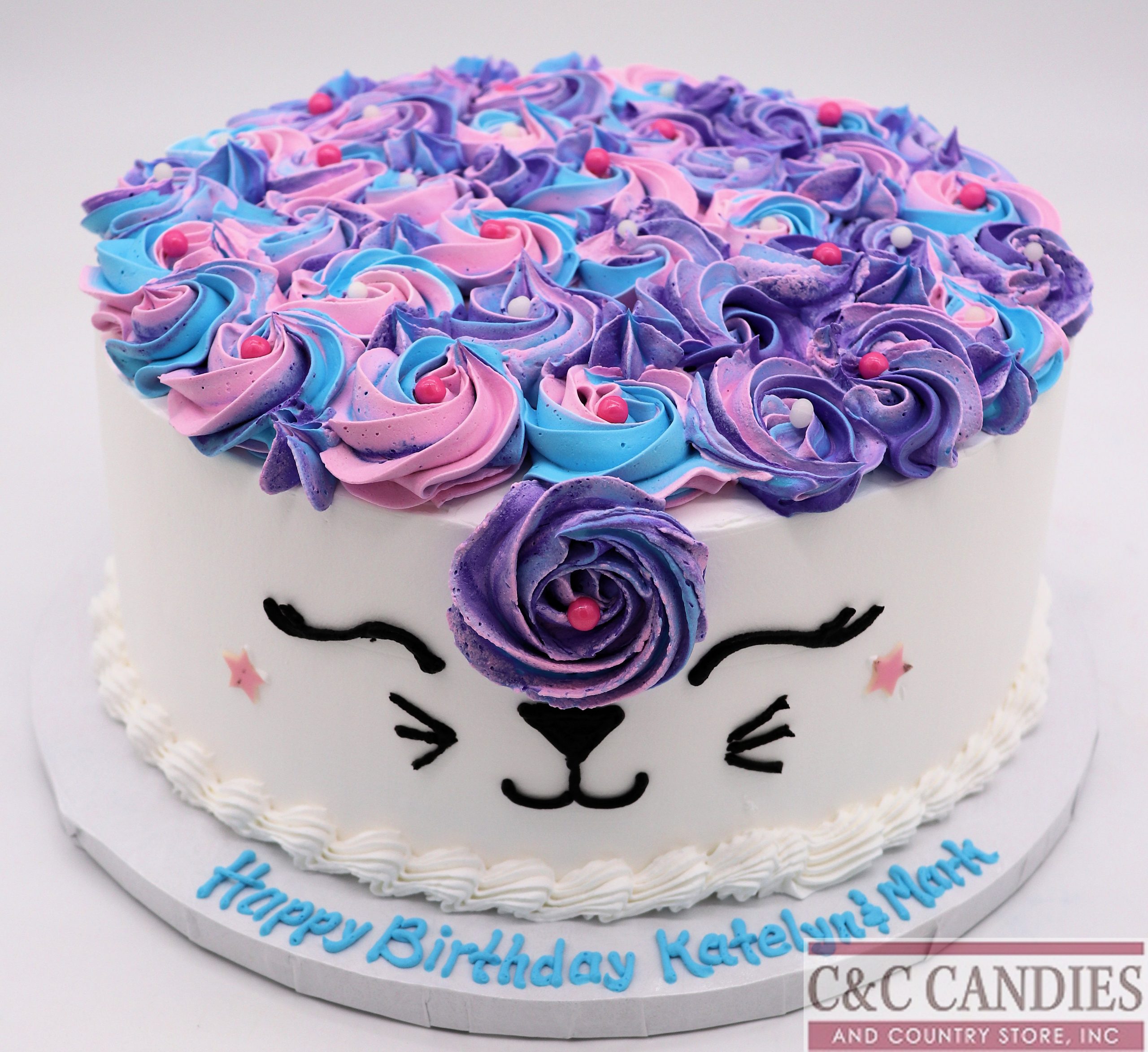 Celebrate in the most adorable way with our Purrfect Party Cake! This sweet cat-themed round cake features a playful pastel mane of purple, pink, and blue rosettes, accented with sprinkles and cute heart-shaped cheeks. Ideal for cat lovers and birthday celebrations alike, it’s available with your choice of buttercream or whipped icing and can be customized with your favorite cake flavor. A delightful centerpiece that’s as fun as it is tasty!