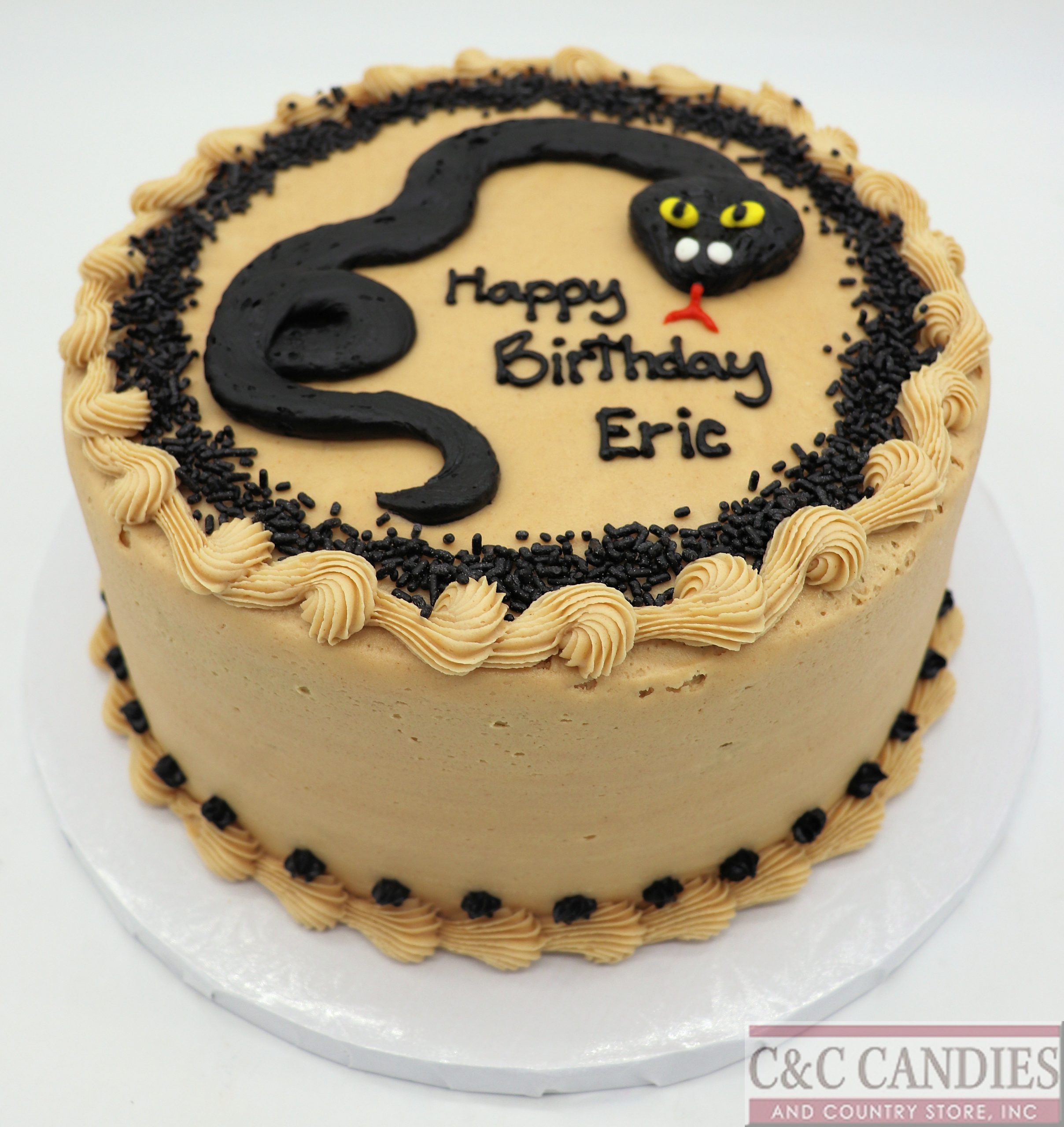 Add a little hiss-terical fun to the celebration with our Sssurprise Party cake! This round cake features a bold black snake slithering across the top, surrounded by dark sprinkles and complementary border piping. It’s the perfect pick for reptile fans, adventurous birthdays, or anyone who enjoys a little edge with their dessert. Available in any icing flavor and color base to suit your party’s vibe.