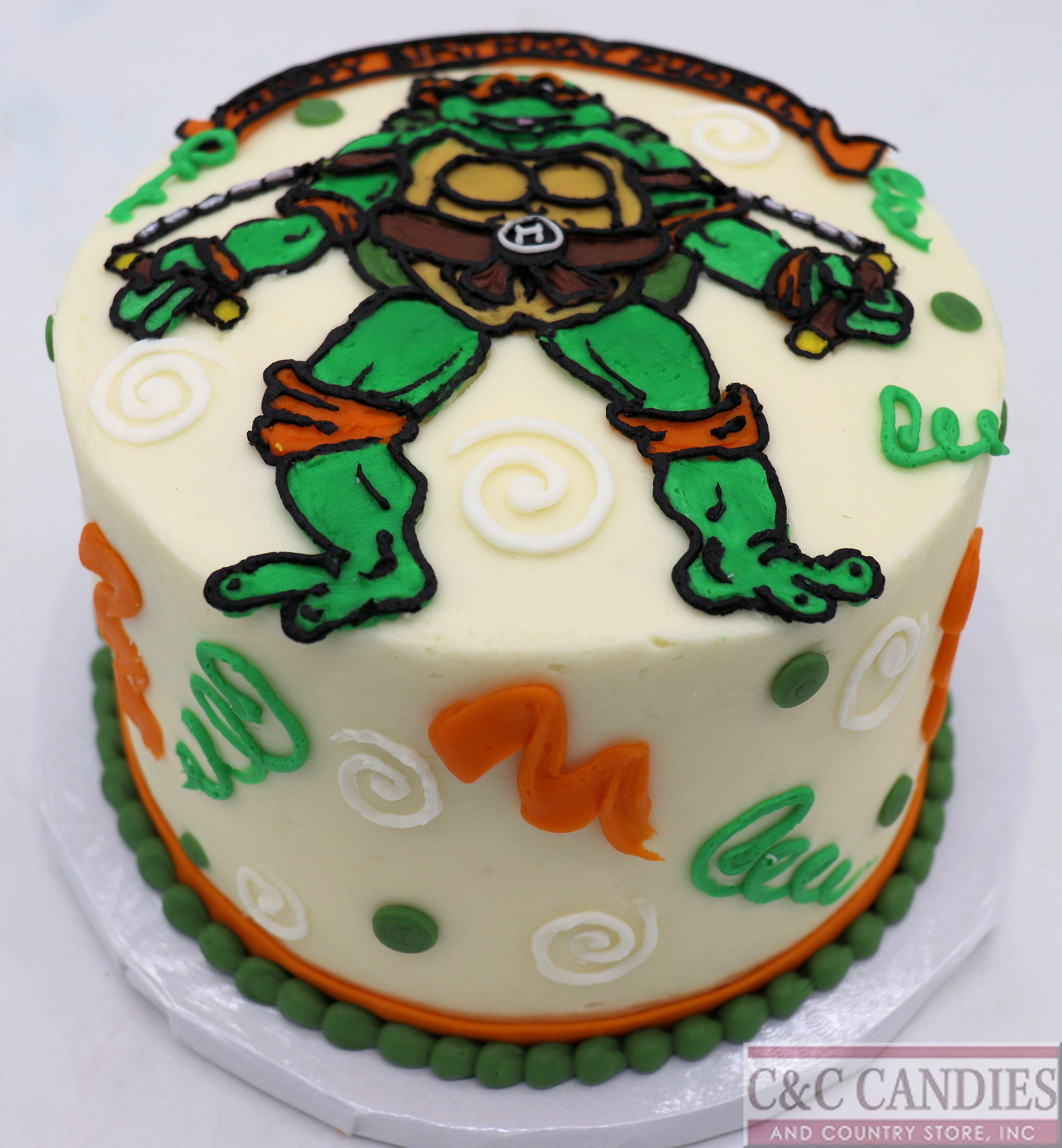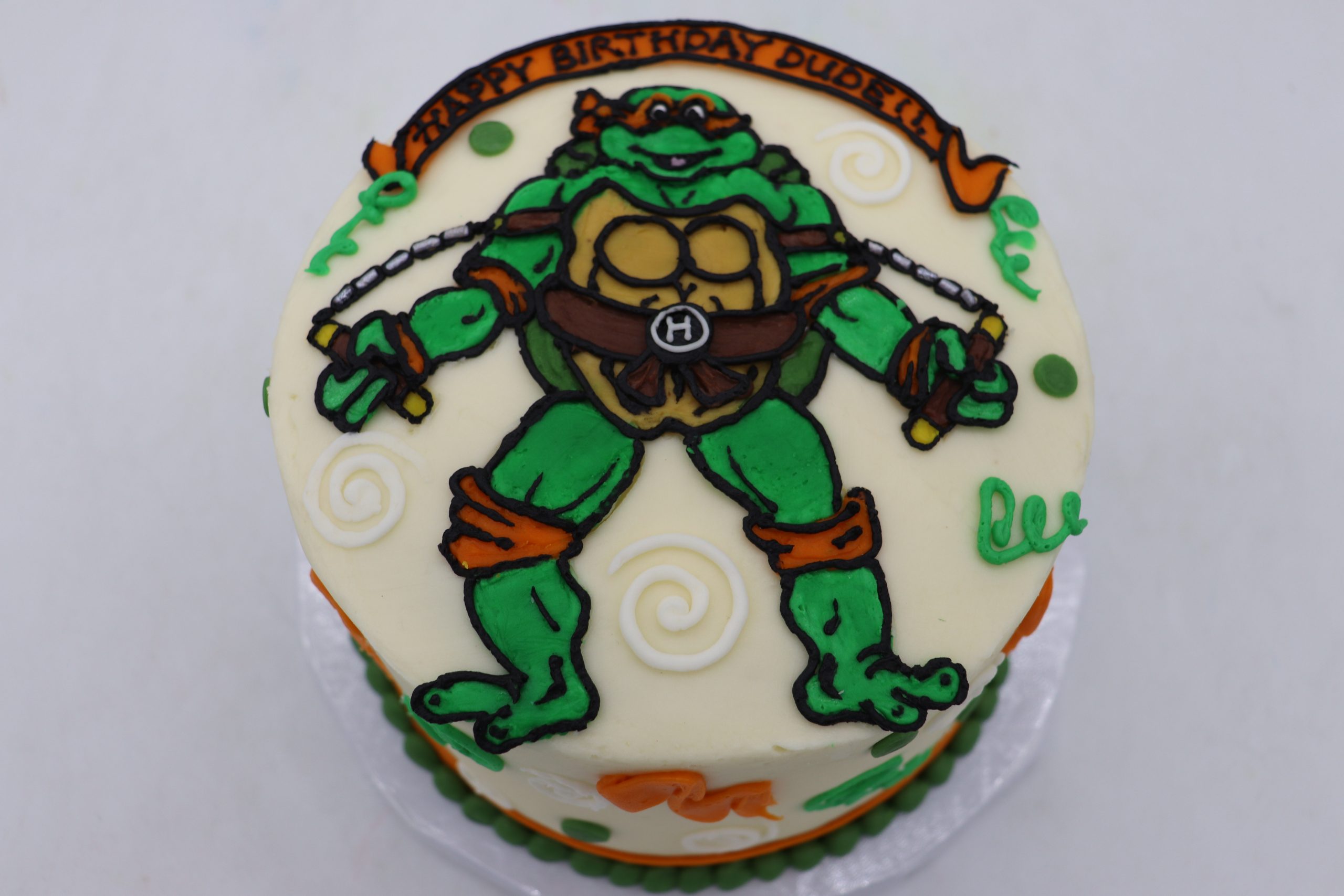 This fun and colorful cake features a hand-piped turtle hero design on top, complete with vibrant green, orange, and classic character details. Swirls, dots, and playful accents wrap around the sides, while coordinating borders in bright green and orange give the cake a finished, dynamic look.