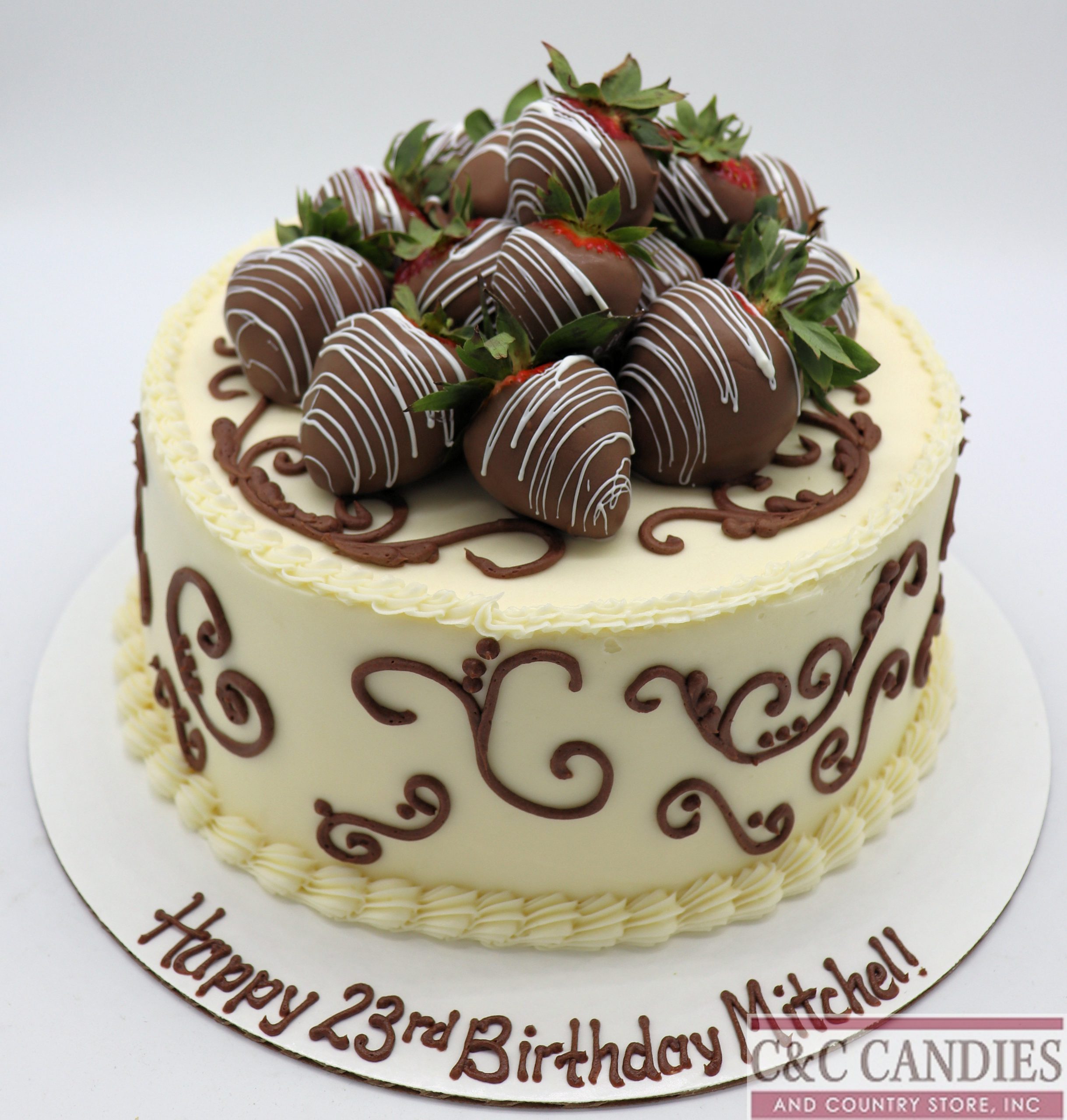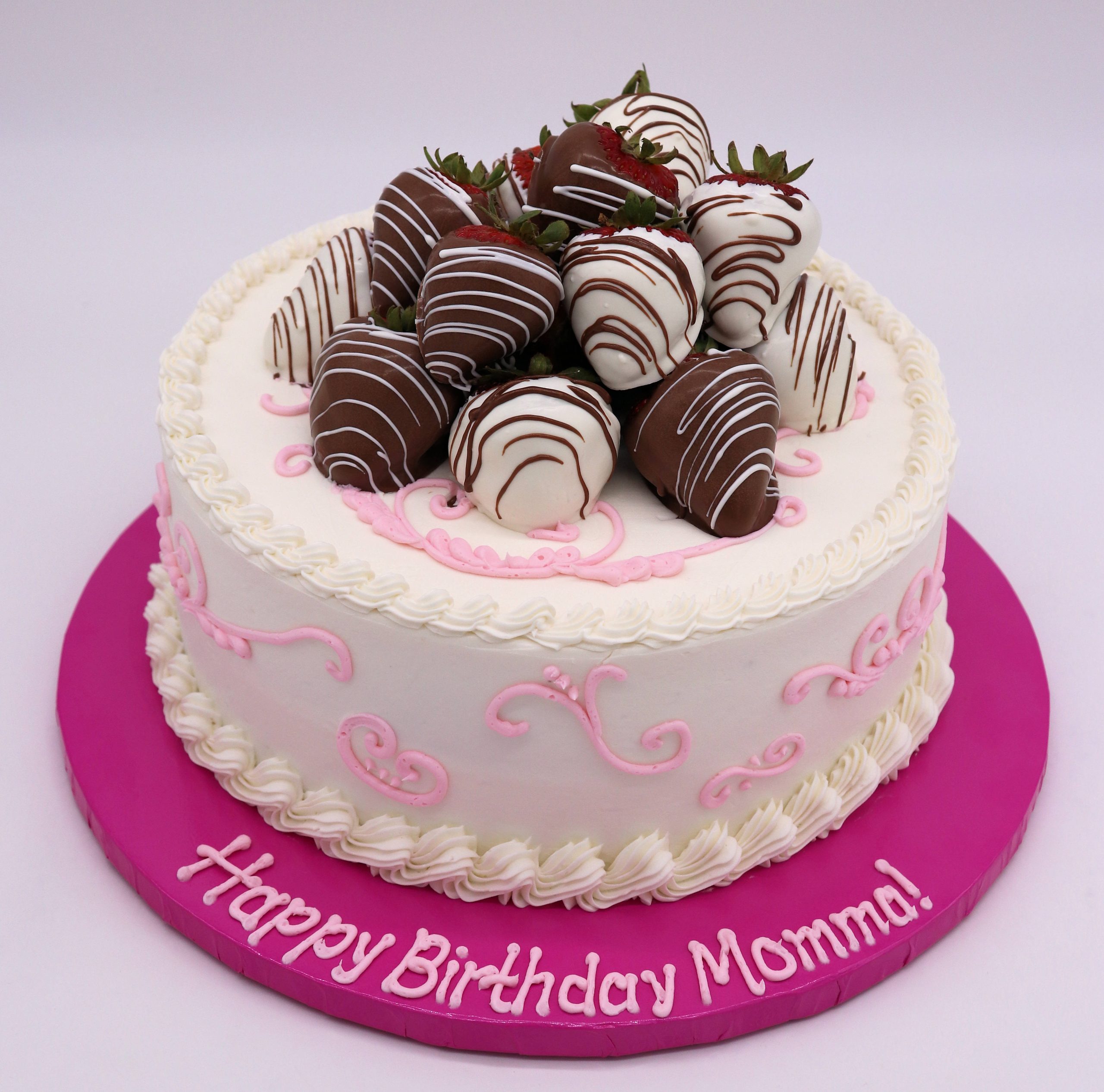 Sweet, elegant, and bursting with berry bliss — our Strawberry Fields Cake is a beautiful centerpiece for any special occasion. This delightful cake is frosted in smooth white icing and adorned with whimsical pink scrollwork for a charming, feminine touch. The top is piled high with luscious chocolate-covered strawberries, drizzled in vibrant pink for extra flair. Choose your favorite cake flavor and filling to make it your own. Whether it’s for a birthday, anniversary, or just because, this cake is a strawberry lover’s dream!