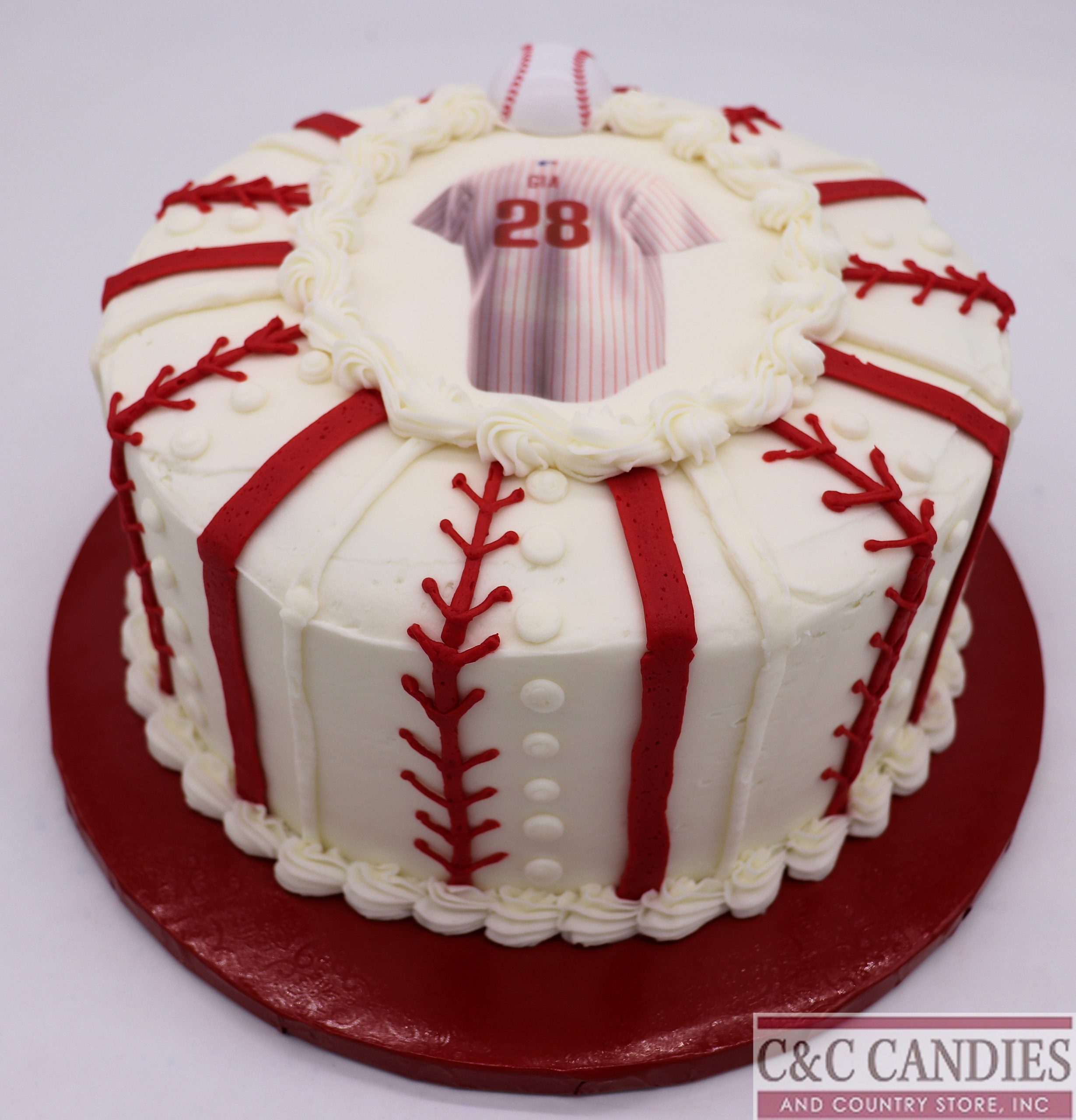 Step up to the plate with our Big League Jersey Cake! This baseball-themed cake is a grand slam for any fan, featuring piped red stitching, button-down jersey detailing, and a personalized photo topper showcasing your favorite player’s jersey. Whether you’re celebrating a birthday, team win, or game day gathering, this cake brings big league style to any occasion.