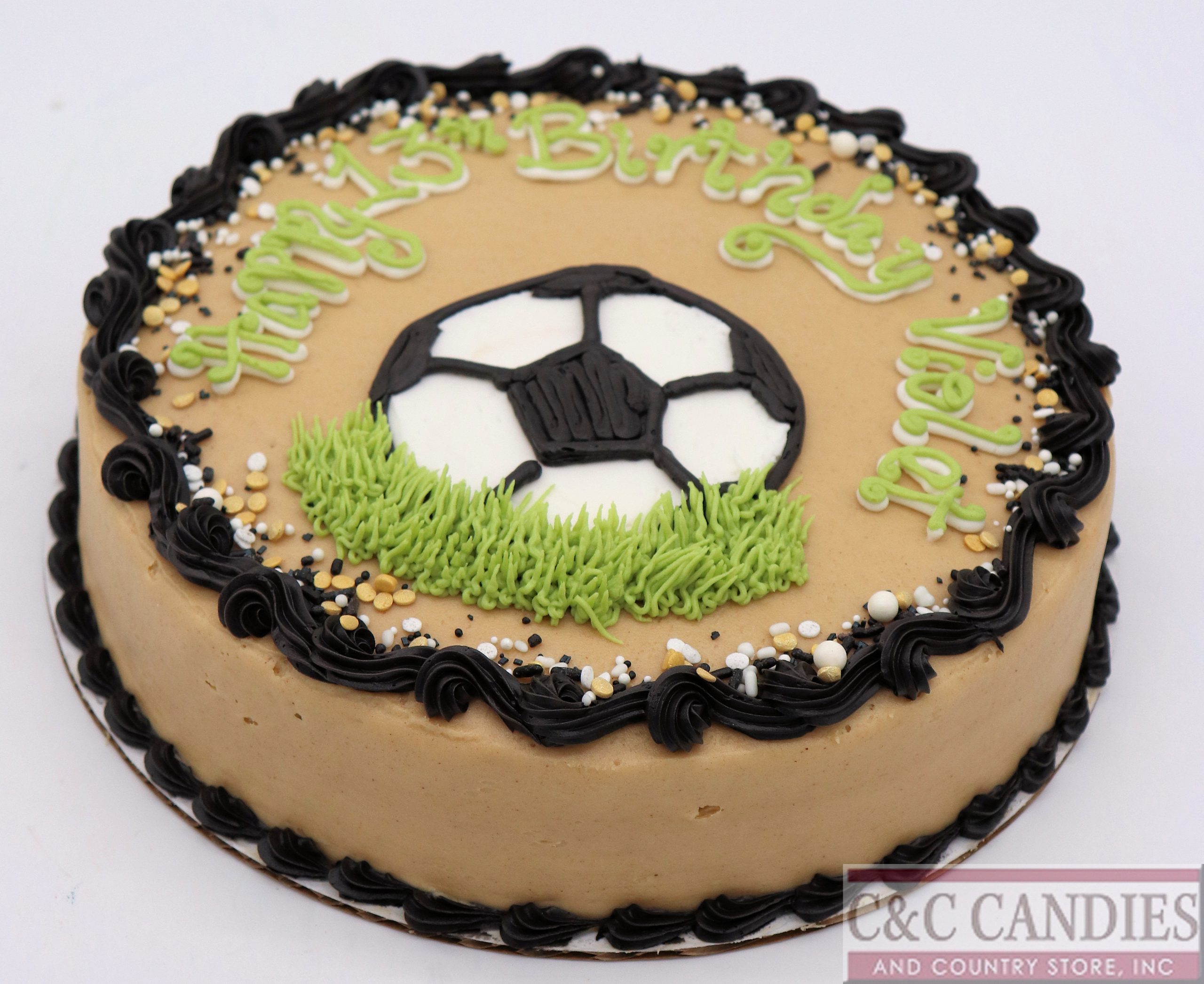 Celebrate your soccer star with our Goal Getter Cake! This sporty round design features a hand-piped soccer ball resting in a patch of green “grass,” surrounded by festive sprinkles and a coordinating border. It’s the perfect cake for birthdays, team parties, season celebrations, or any fan of the beautiful game.
