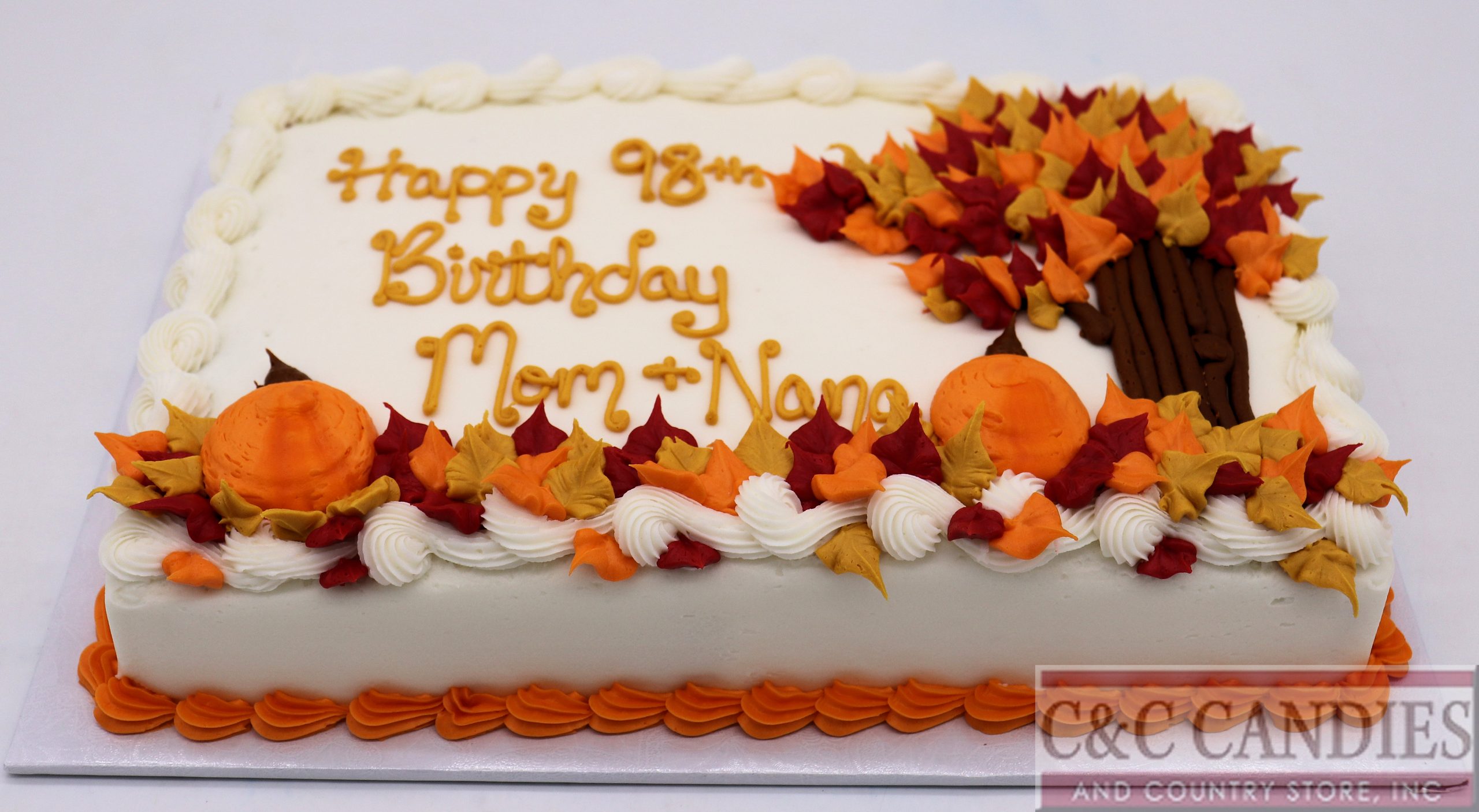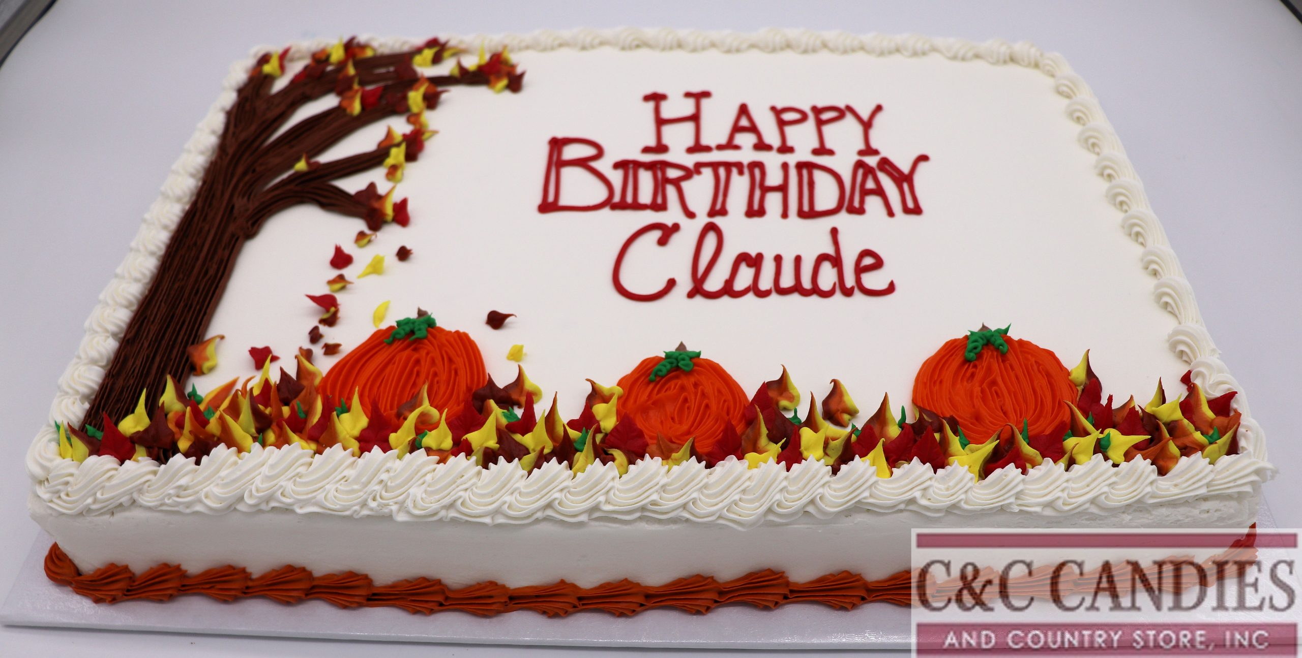 Celebrate fall birthdays and festive gatherings with our Autumn Tree & Pumpkins Sheet Cake! This seasonal favorite features hand-piped pumpkins, a graceful bare tree, and vibrant fall leaves in red, yellow, and orange tones. Perfect for autumn birthdays, harvest parties, or Thanksgiving dessert tables, this beautiful sheet cake is available in a variety of delicious flavors and icings.