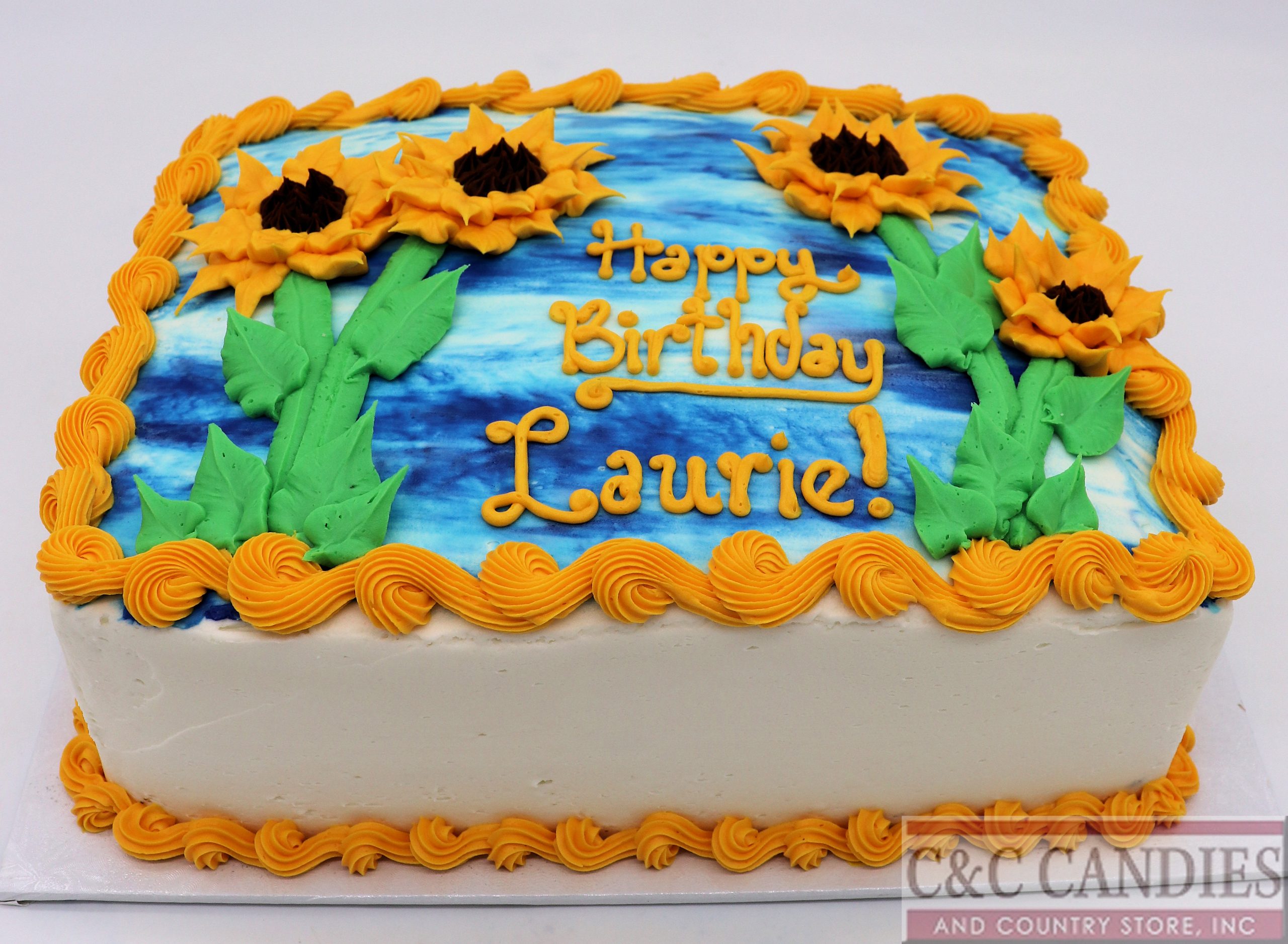 Add a burst of sunshine to your next celebration with our Blooming Sunflowers Sheet Cake! This cheerful design features three hand-piped sunflower blooms surrounded by delicate leaves and finished with festive blue accents and sprinkles. Perfect for birthdays, retirement parties, summer gatherings, or just to make someone smile, this cake is a joyful centerpiece that’s as beautiful as it is delicious.