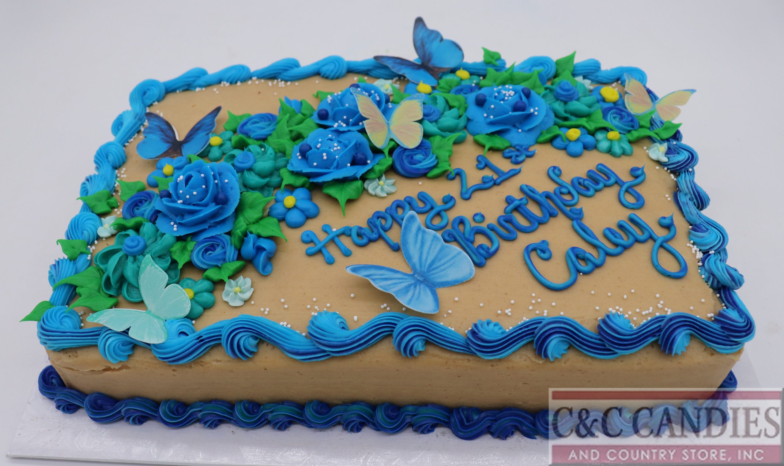 Graceful and enchanting, our Butterfly Blooms Sheet Cake is the perfect centerpiece for birthdays, spring events, garden parties, or anyone who loves a whimsical touch. This dreamy design features clusters of hand-piped flowers in your choice of color, surrounded by lush green leaves and topped with delicate edible butterflies that appear to flutter across the cake. A coordinating border and tiny sugar pearls complete the magical garden effect.