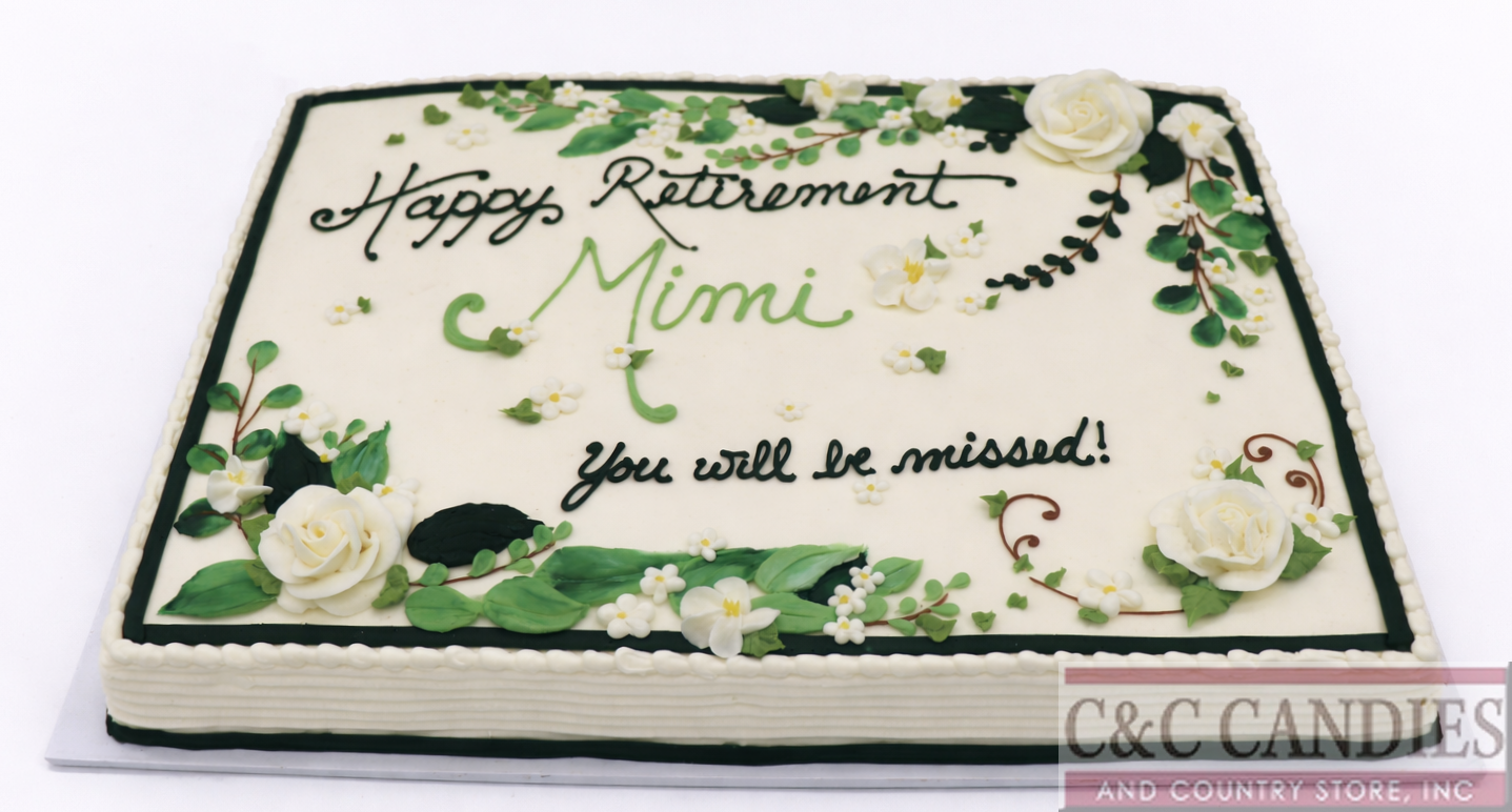 Every detail is carefully piped in buttercream, giving the cake dimension and texture while keeping it fully delicious and sliceable. The classic color palette of white and rich green makes this design perfect for retirement parties, anniversaries, milestone birthdays, bridal showers, sympathy gatherings, and any occasion that calls for understated elegance.