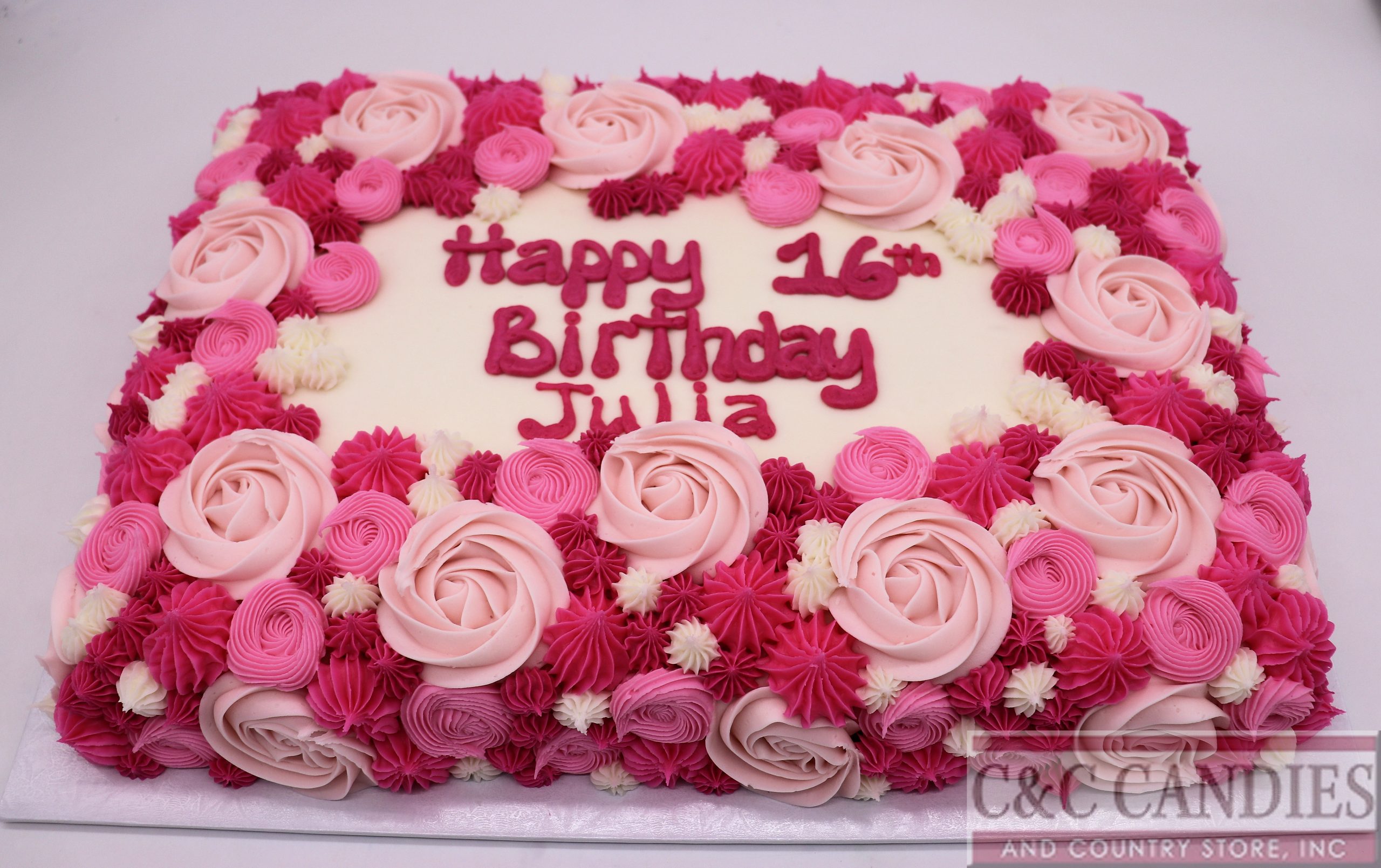 Brighten any celebration with our Rosy Radiance Sheet Cake, a stunning floral masterpiece bursting with rosettes and star-tipped flowers in vibrant shades of pink and cream. This elegant yet playful design wraps the cake in beauty, making it ideal for birthdays, sweet sixteens, bridal showers, or any occasion that calls for something truly special. Customize with your favorite cake flavor, icing type, and message to make it uniquely yours.