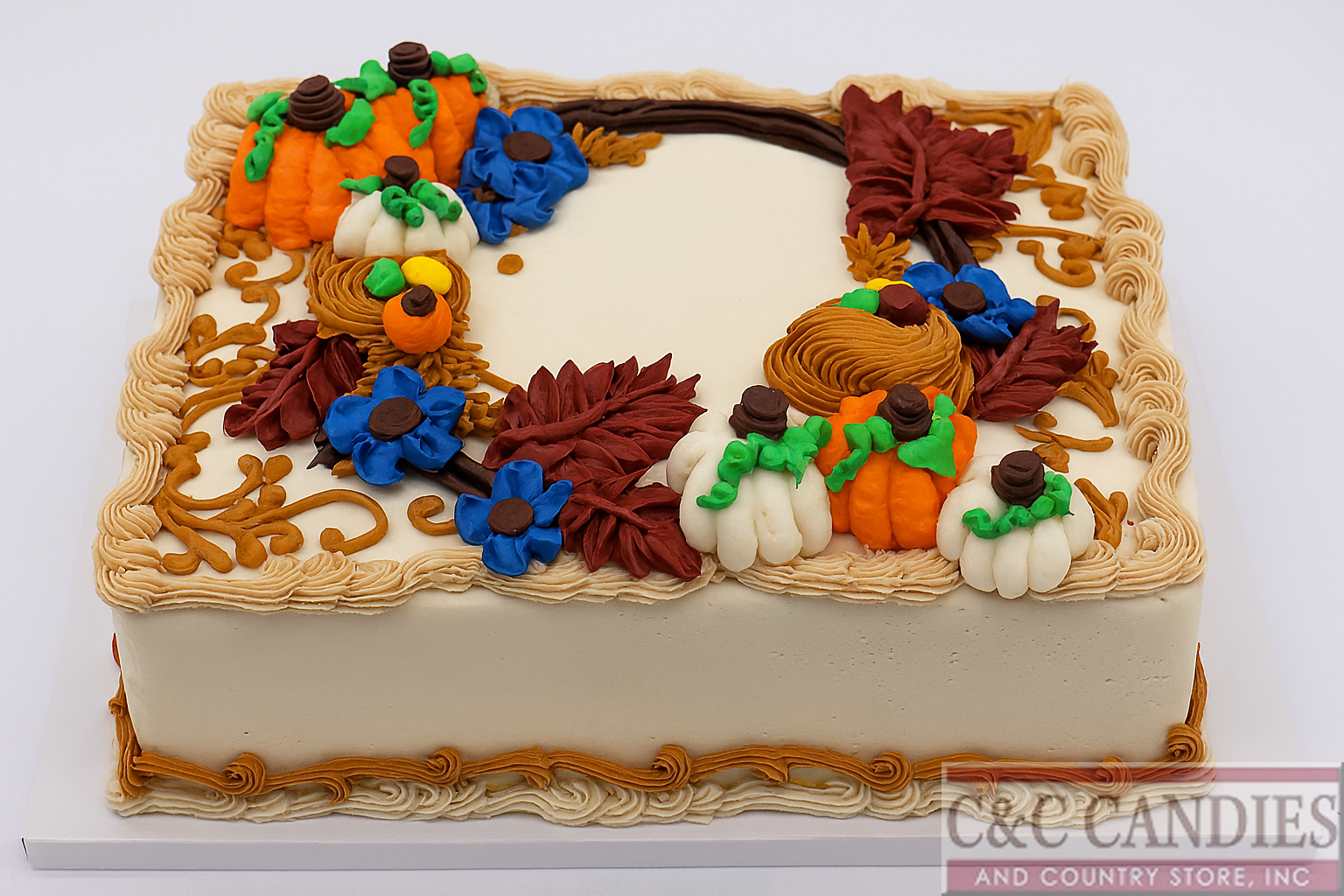 Celebrate the cozy beauty of fall with our Autumn Harvest Wreath Cake, featuring a charming ring of pumpkins, flowers, leaves, and vines in rich autumn hues. This square sheet cake is perfect for birthdays, Thanksgiving, or any fall celebration, and it’s available in your choice of cake flavor and icing. The intricate wreath design, made entirely from icing, creates a festive centerpiece that tastes as good as it looks. Whether you’re hosting a gathering or surprising someone special, this cake brings the warmth of the season to your dessert table.
