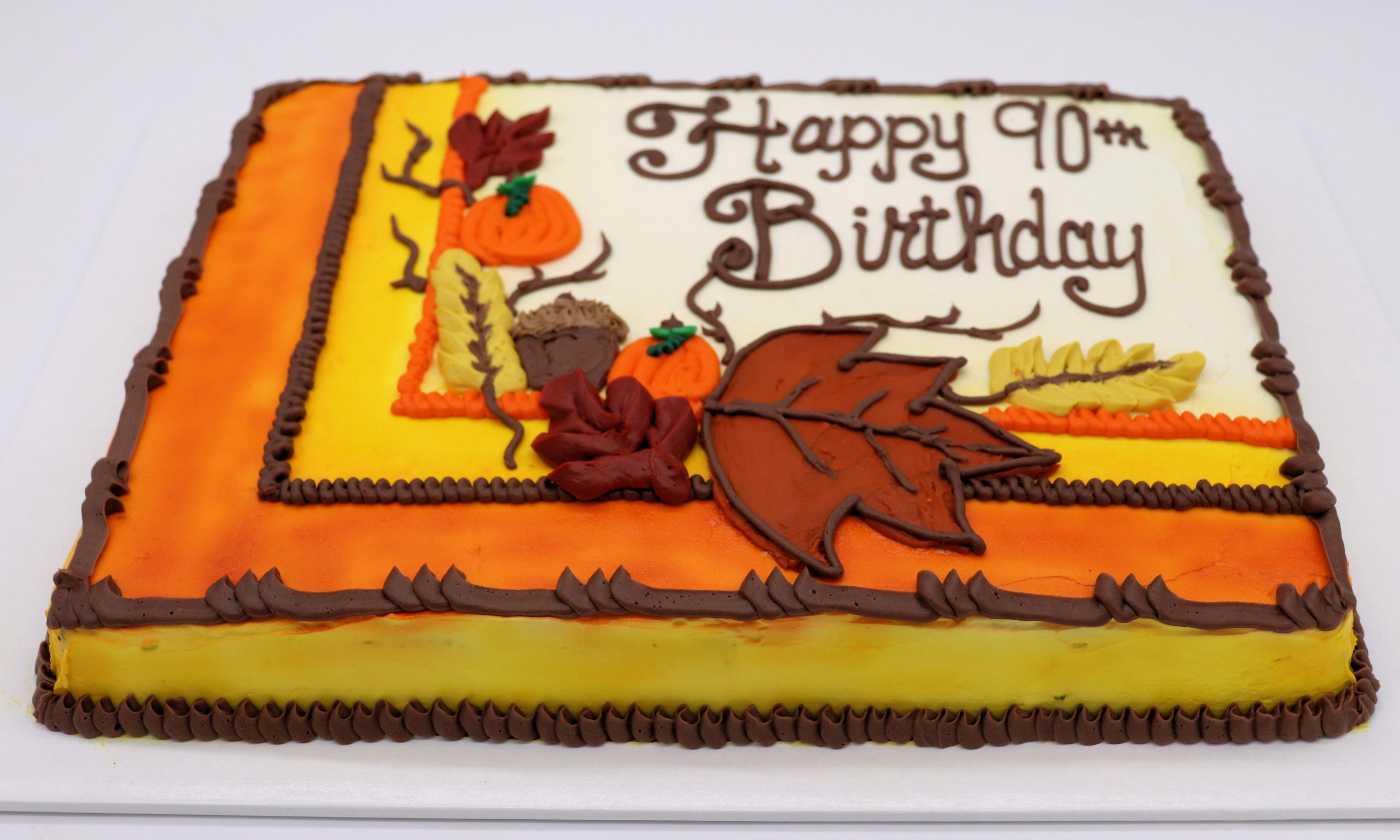 Celebrate the beauty of autumn with our Fall Harvest Delight Sheet Cake, a seasonal favorite that captures the cozy charm of fall. Featuring festive decorations like pumpkins, colorful leaves, acorns, and cornstalks, this cake is the perfect choice for birthdays, Thanksgiving gatherings, or any fall-themed celebration. The vibrant orange and yellow accents bring warmth and cheer to the design — please note these colors are only available in buttercream and cannot be replicated in other icings. Customize your cake with a variety of delicious flavors and enjoy a handcrafted centerpiece that tastes as good as it looks.