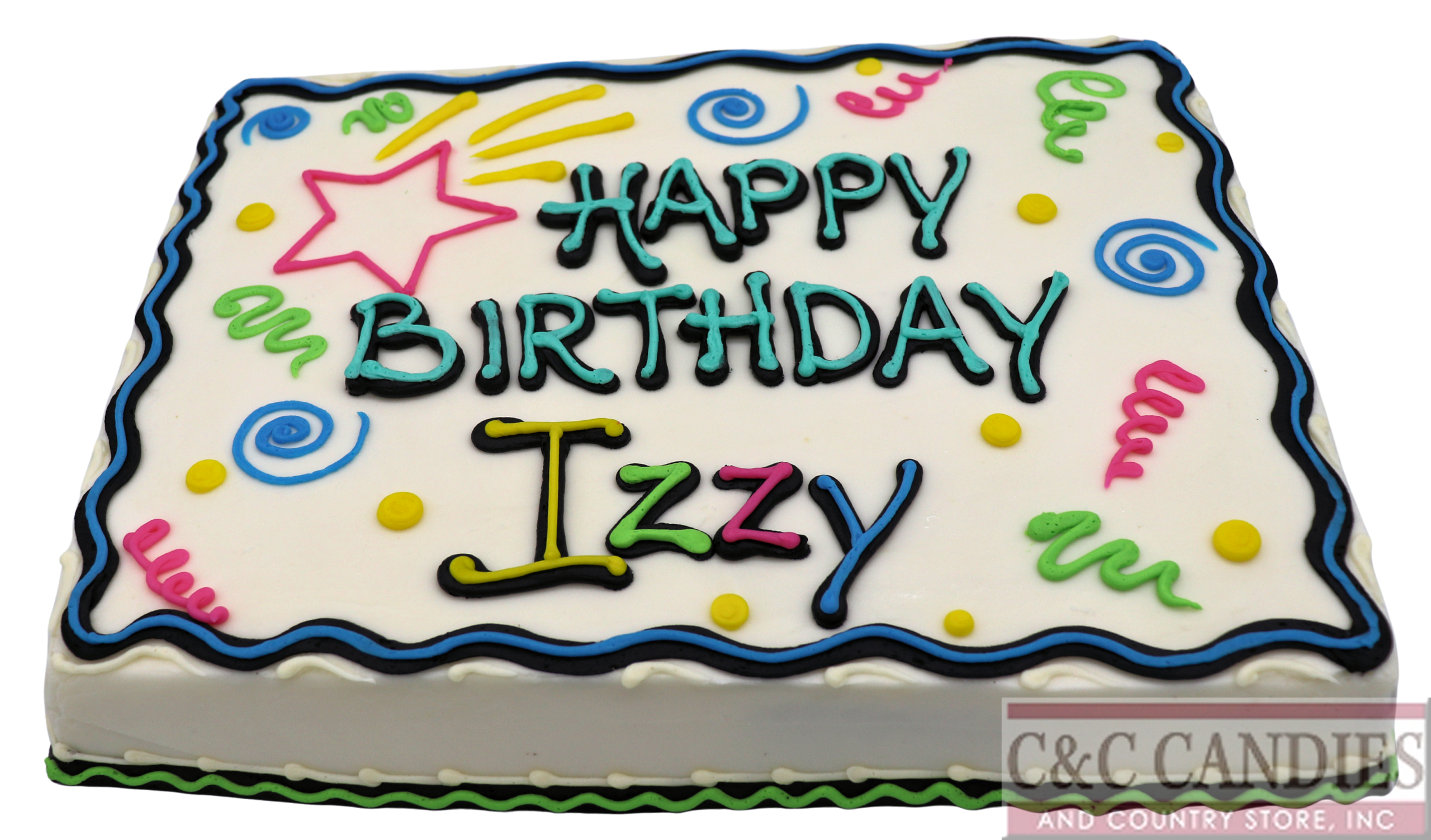 Decorated with vibrant neon piping in electric pink, bright yellow, lime green, and bold blue, this design features playful stars, swirls, dots, and retro accents that capture the unmistakable spirit of the 1980s. The bright, hand-piped lettering pops against a smooth iced background, giving it that classic, high-contrast neon glow look. Whether you’re celebrating an 8th birthday, 18th birthday, 40th birthday, or an 80s-themed bash, this cake is a guaranteed showstopper.