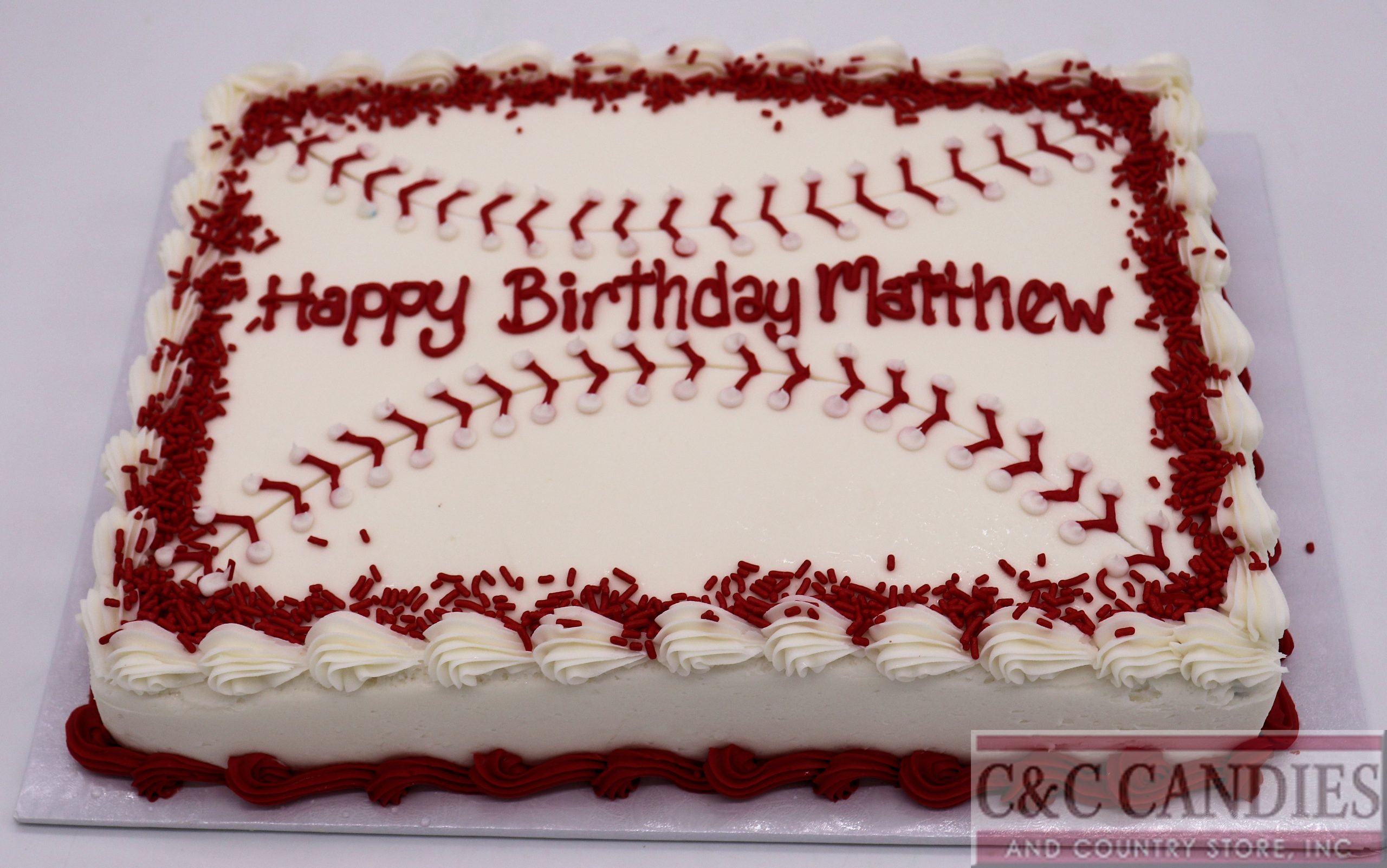 Hit a home run with our Baseball Sheet Cake! This sporty and festive cake features red stitching details that mimic the look of a real baseball, accented with matching sprinkles and a personalized birthday message. It’s the perfect pick for baseball fans of all ages, whether you’re celebrating a birthday, team win, or end-of-season party.