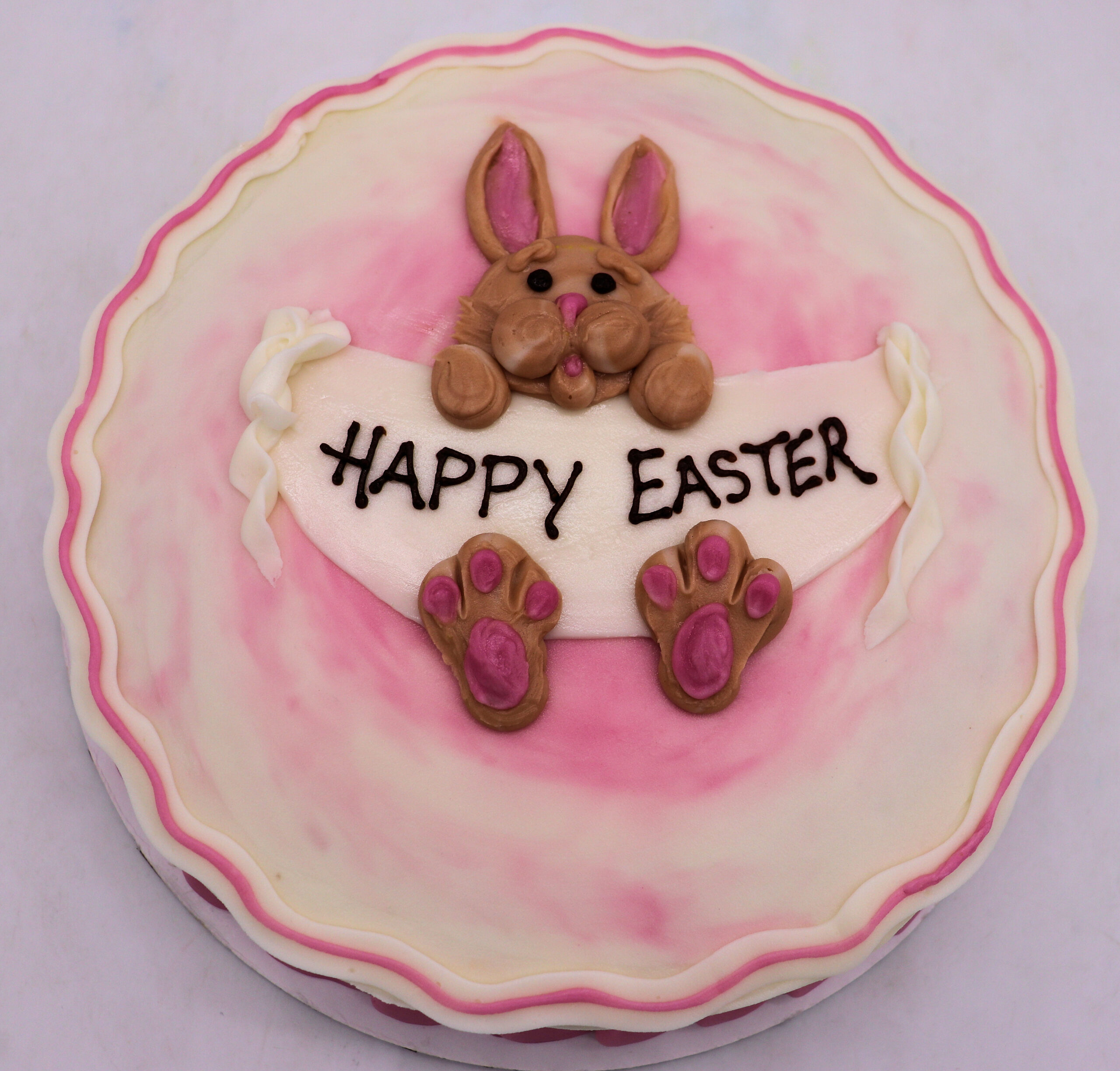 Say hello to Bella Bunny, the sweetest little guest at your Easter celebration! This adorable cake features a cute bunny holding a festive banner, surrounded by soft pastel colors and hand-decorated details that make it perfect for Easter, spring birthdays, or any seasonal gathering. The classic design has a homemade feel and is a favorite for families looking for a cheerful holiday cake.