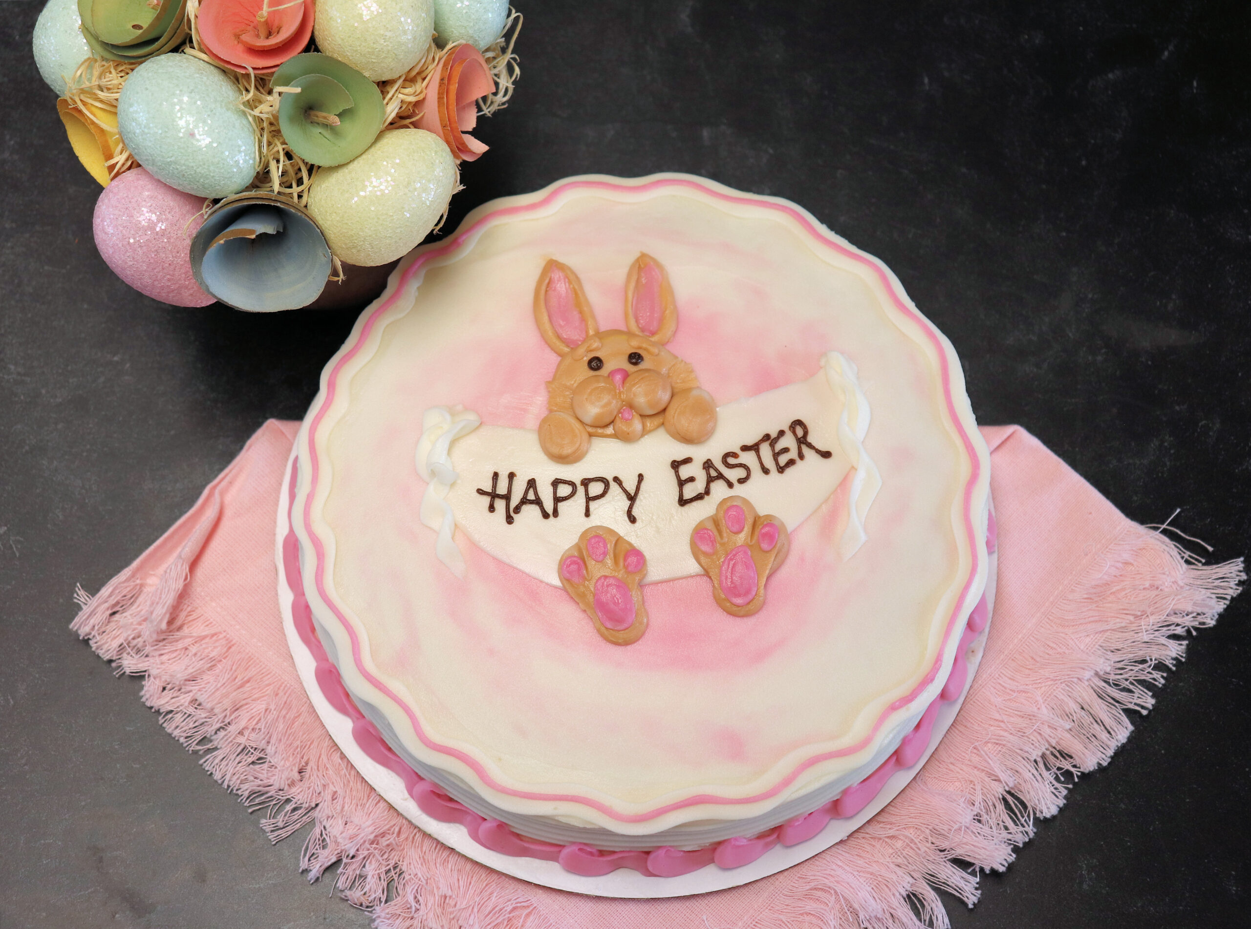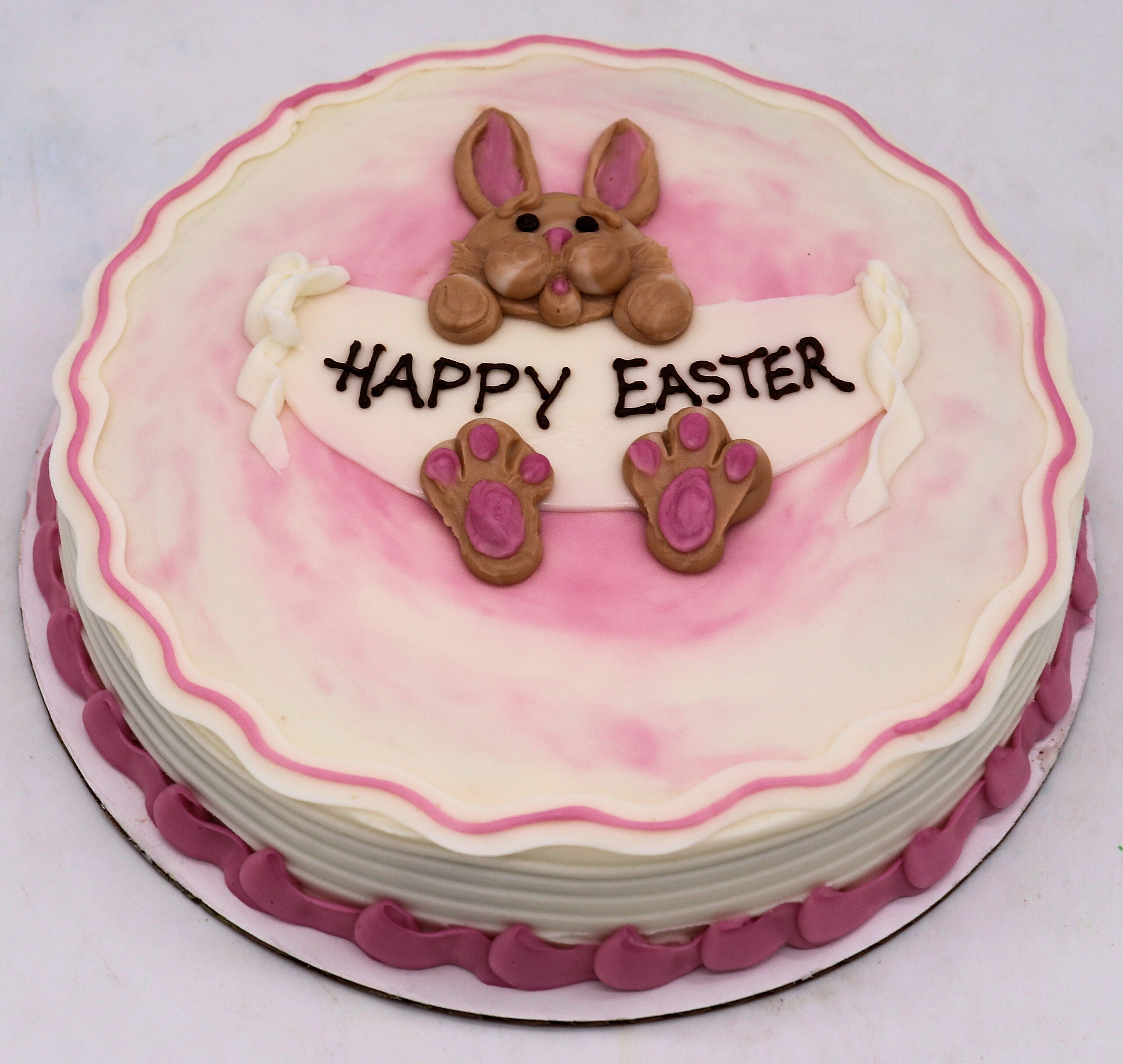 This cake can be made in your choice of cake flavor and icing, including buttercream or whipped icing. The banner message can be customized for your occasion, and colors may be changed to match your celebration. Each cake is hand-decorated, so bunny details, shading, and writing may vary slightly from cake to cake.