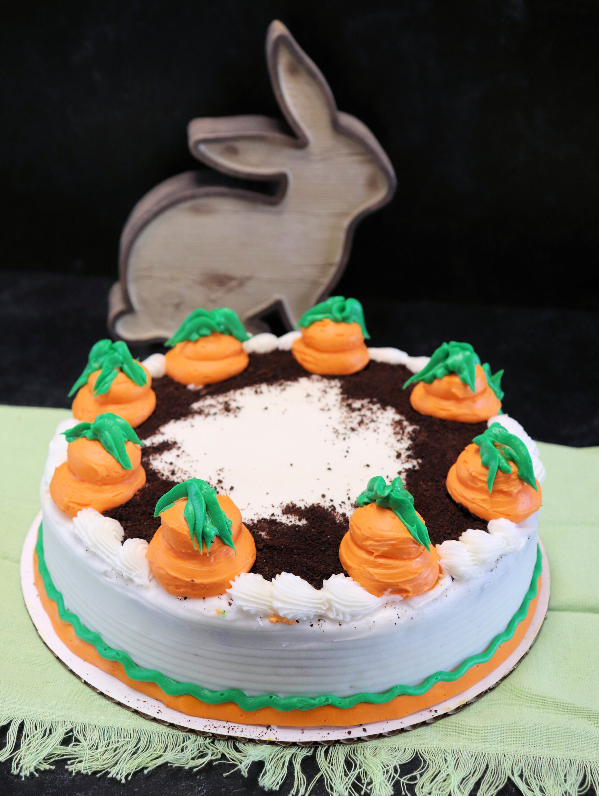 This cake can be made in your choice of cake flavor and icing, including buttercream or whipped icing. Each cake is hand-decorated, so carrot placement, colors, and details may vary slightly, giving every cake its own unique charm.