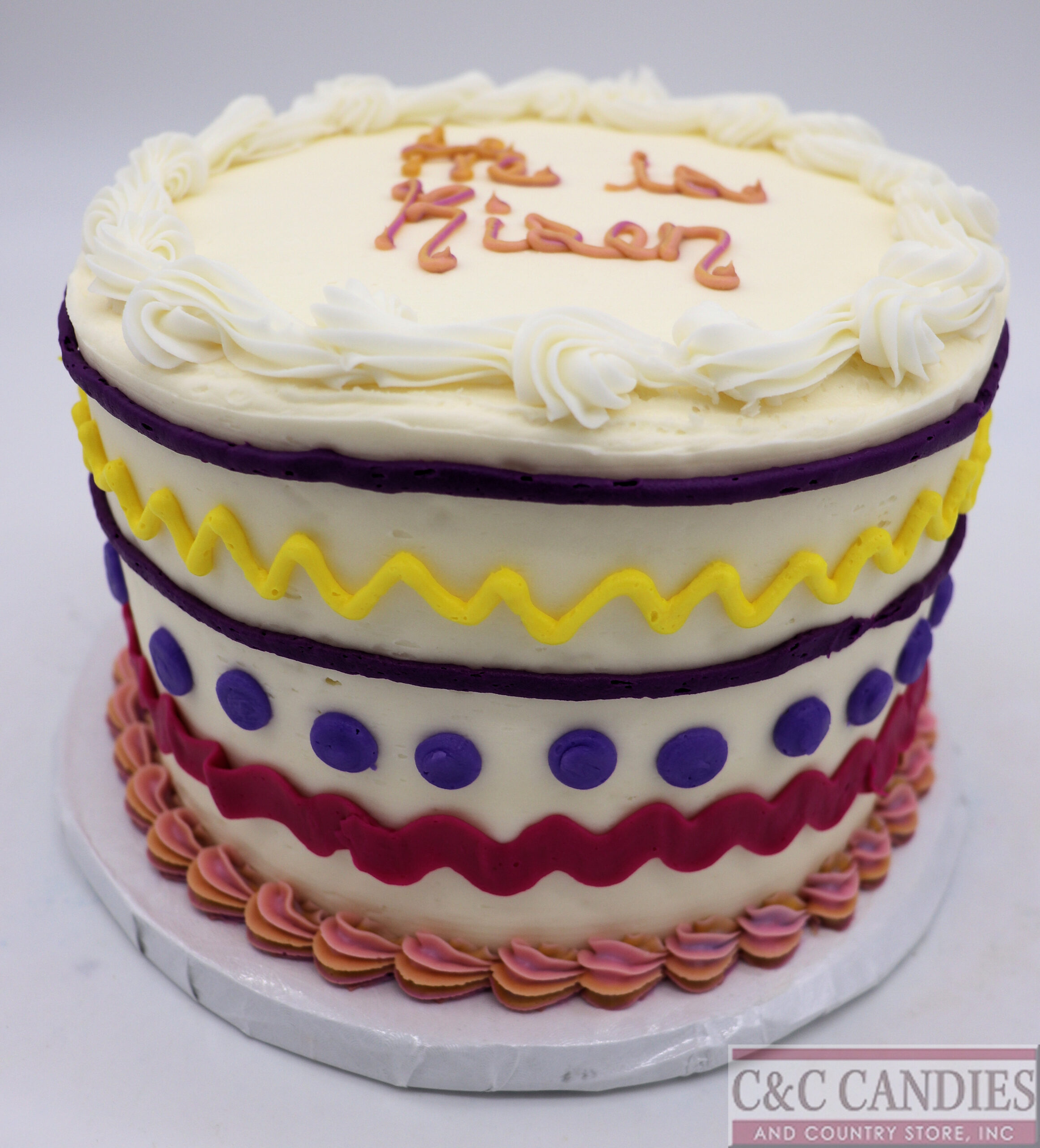 Celebrate Easter with this joyful and colorful buttercream cake, beautifully decorated in a festive Easter egg-inspired design. Featuring vibrant zig-zag and dot patterns in purple, yellow, and pink tones, this round cake brings playful holiday charm to any dessert table. The top is finished with the hand-piped message ‘He is Risen,’ surrounded by elegant buttercream swirls for a meaningful and decorative touch. Made entirely with smooth, creamy buttercream icing, this cake is perfect for Easter brunches, church gatherings, or as a thoughtful seasonal gift. A delicious and heartfelt way to honor the spirit of the holiday.