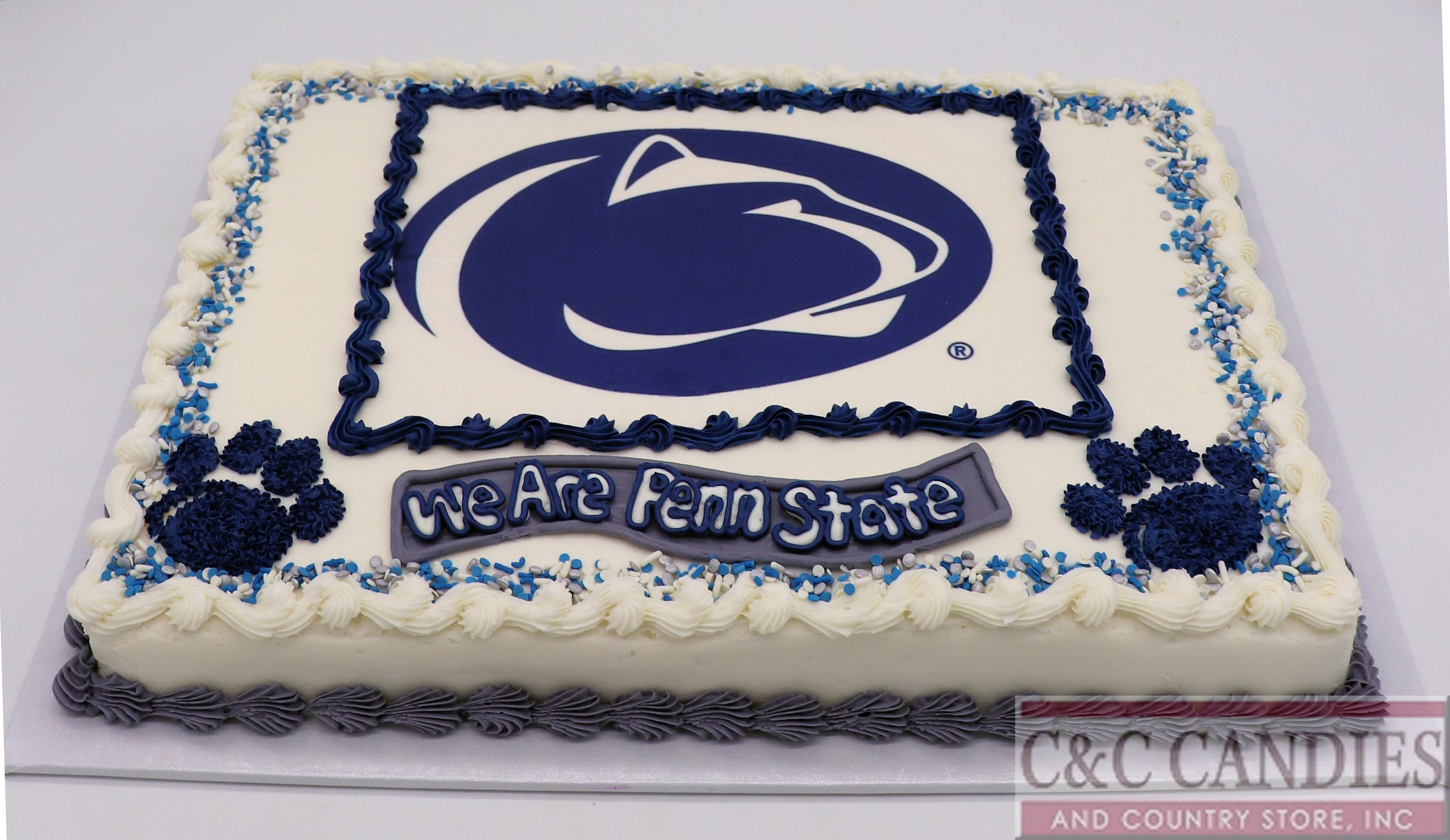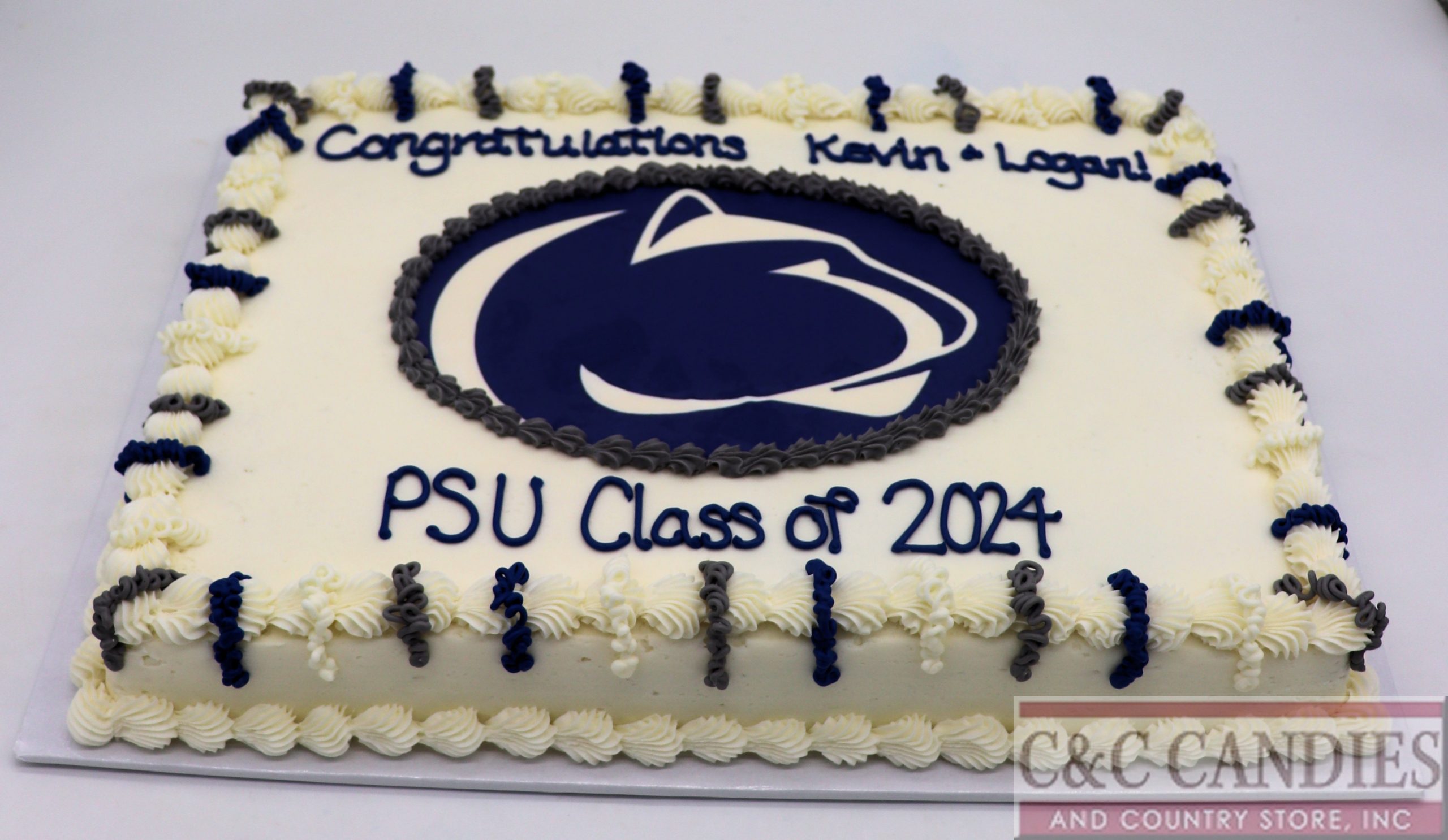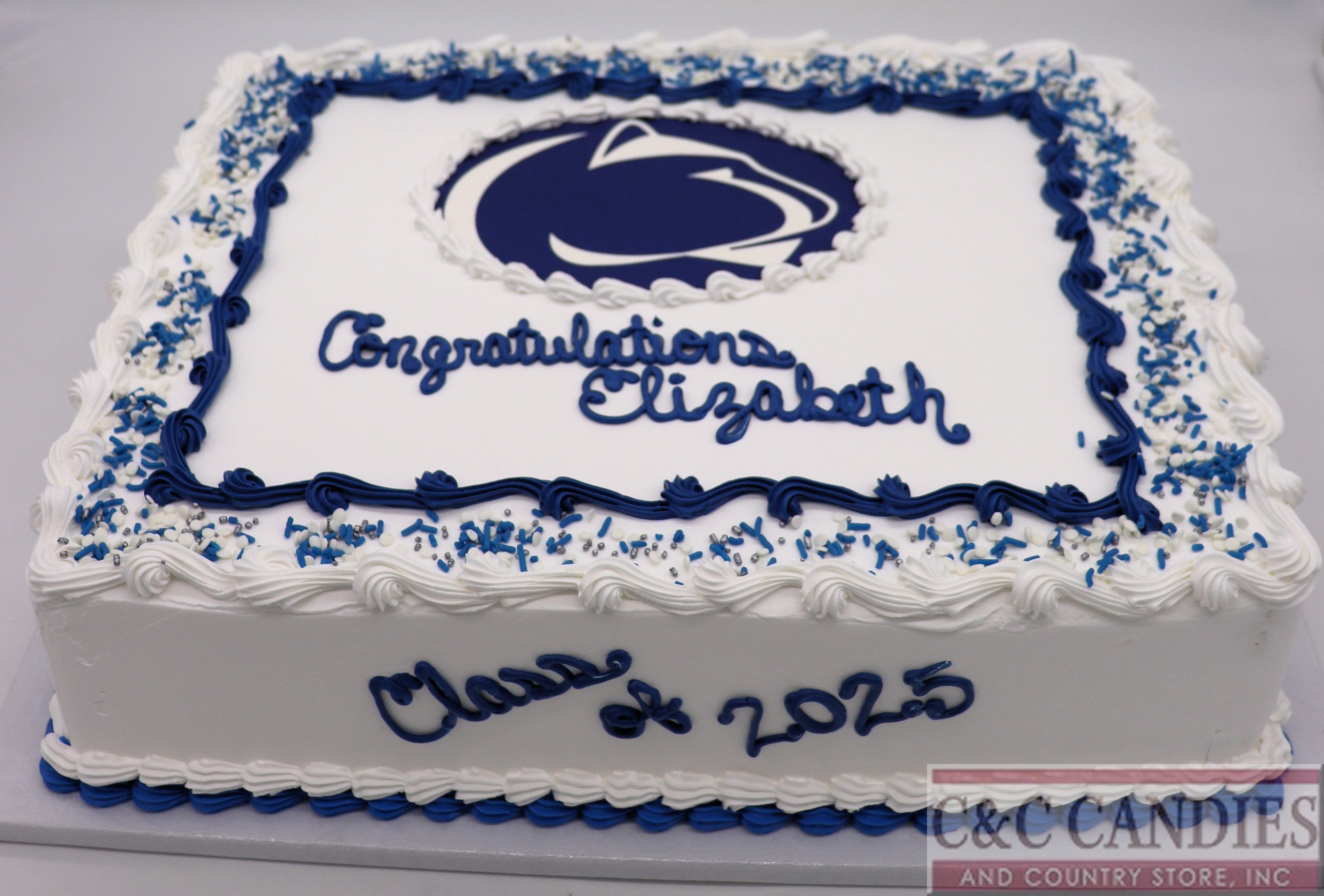 Celebrate your Penn State graduate in true Nittany Lion style! This sheet cake proudly features an edible image of the iconic Penn State logo, accented with school colors and classic graduation wording. Perfect for graduation parties or college send-offs, this design can be personalized with a name and class year.
