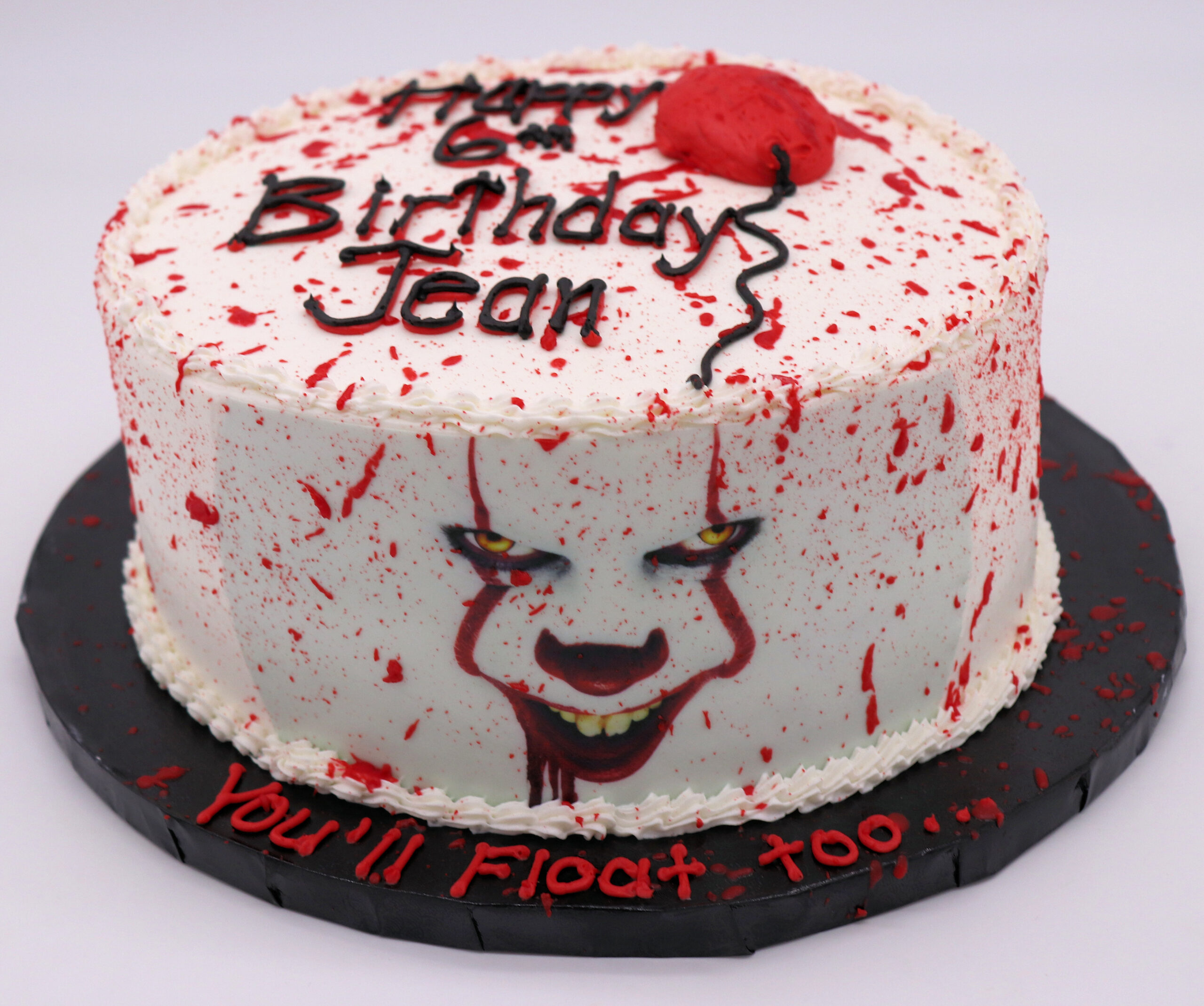 Dare to take a bite of our IT Double Layer Round Cake, inspired by the terrifying Pennywise the Clown. This double-layered showstopper features red splatter details, an eerie edible image, and a signature red balloon—perfect for Halloween parties, horror movie fans, or themed birthdays. Crafted with buttercream icing for the best visual impact and flavor, this spooky treat will have your guests floating with fright and delight.