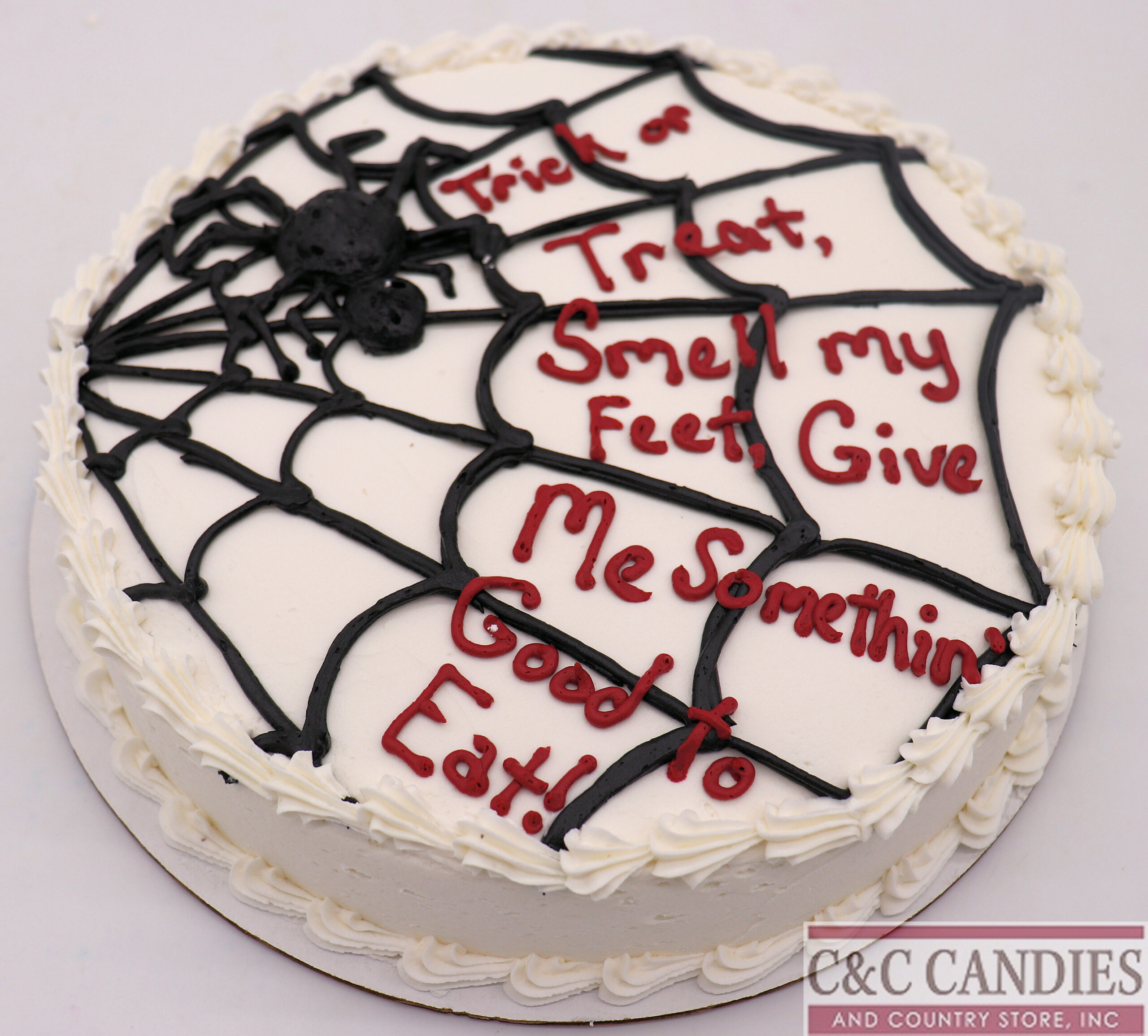 Creep it real this Halloween with our Spider Web Round Cake! Decorated with a bold black web and a spooky spider, this festive design includes the classic Halloween rhyme: “Trick or Treat, Smell My Feet, Give Me Somethin’ Good to Eat!” Perfect for parties, haunted gatherings, or spooky birthdays, this cake is a fang-tastic centerpiece for your celebration. Available in your choice of cake flavors and icings to match your taste.