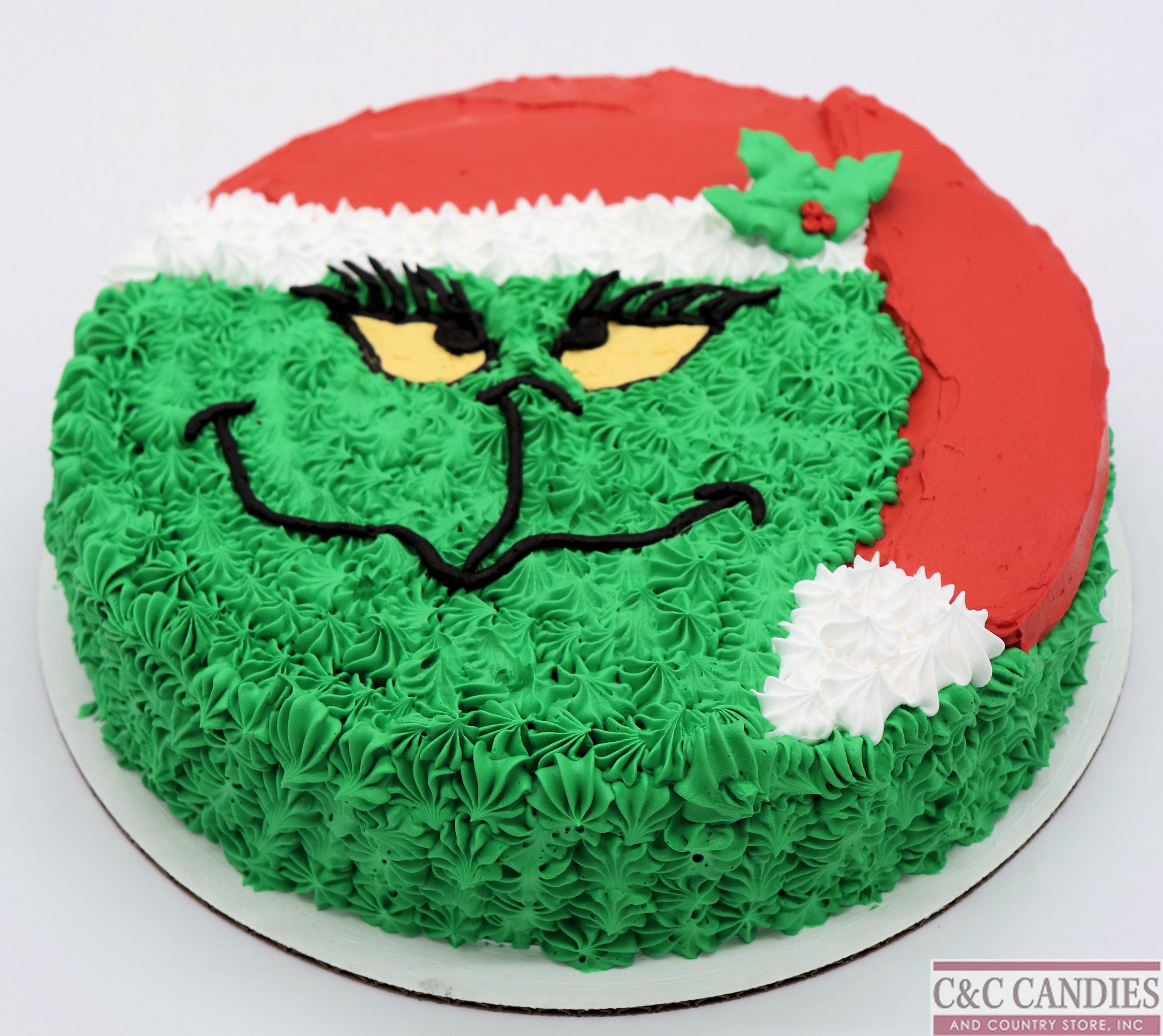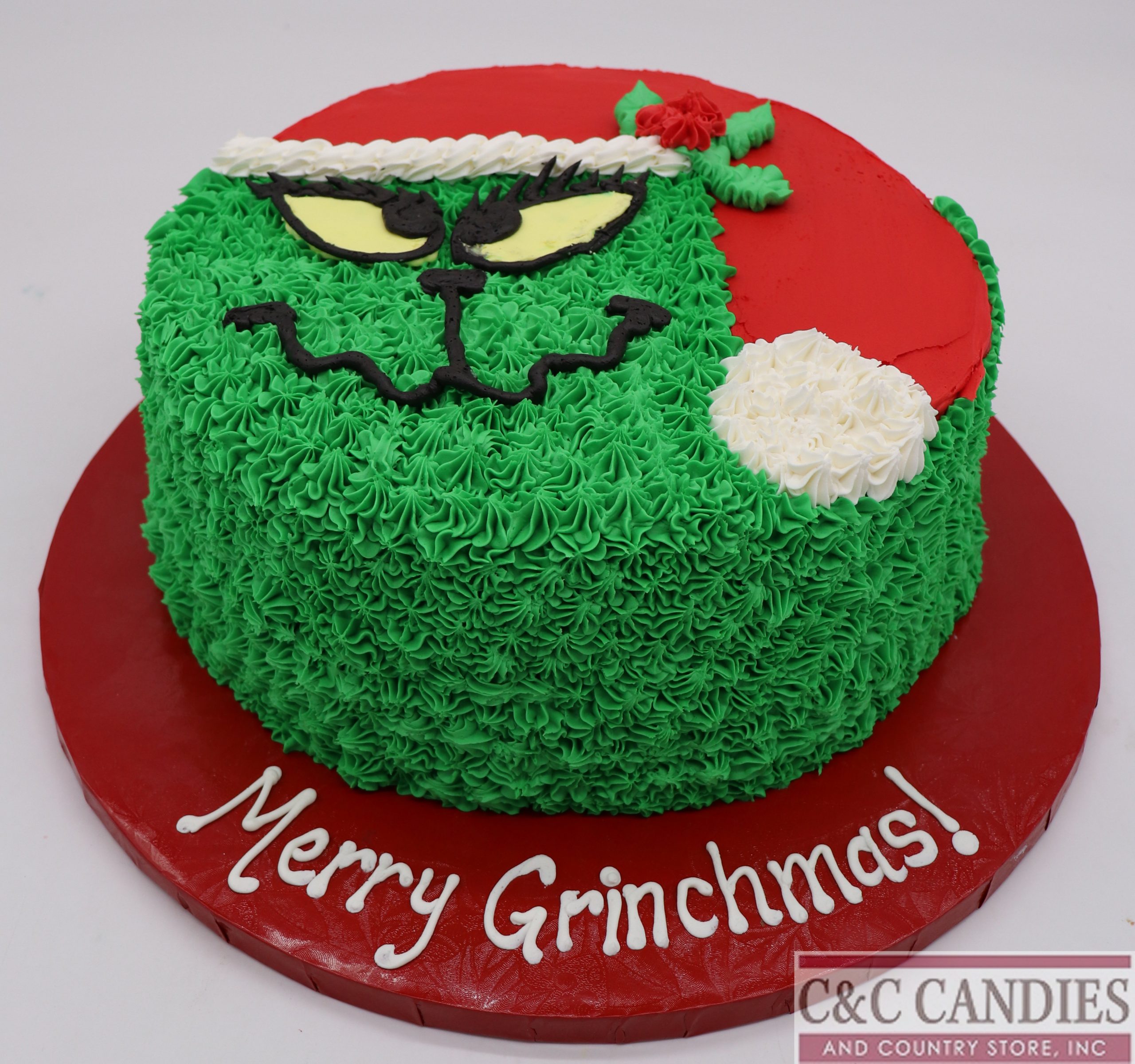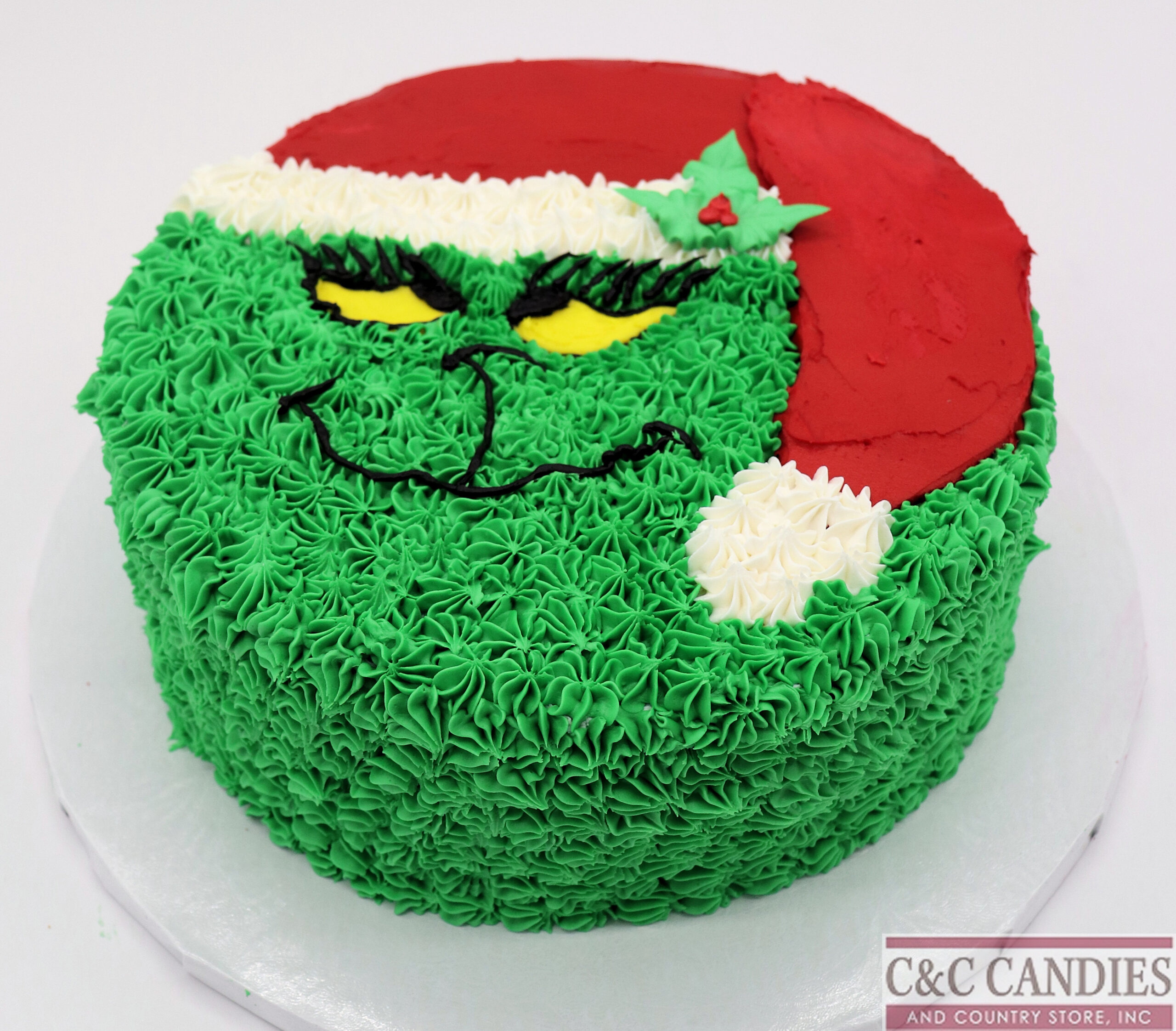 Steal the show (but not Christmas) with our Grinch Round Cake! Decorated in all buttercream with star-tip texture, the iconic Grinch face, and a festive Santa hat, this cake is perfect for holiday parties and lovers of this mischievous holiday classic. A playful and memorable centerpiece for any celebration.