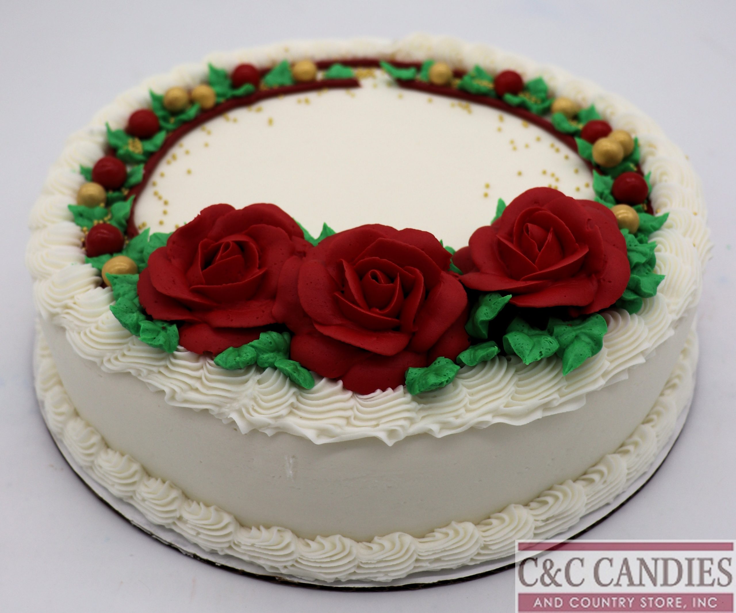Elegant and festive, our Holiday Roses Round Cake features beautiful red buttercream roses surrounded by vibrant green leaves, gold and red accent balls, and a delicate swirl border. A classic and sophisticated choice for Christmas gatherings, December birthdays, or holiday anniversaries. The center is left open for a custom message, making it a perfect personalized treat for your celebration.