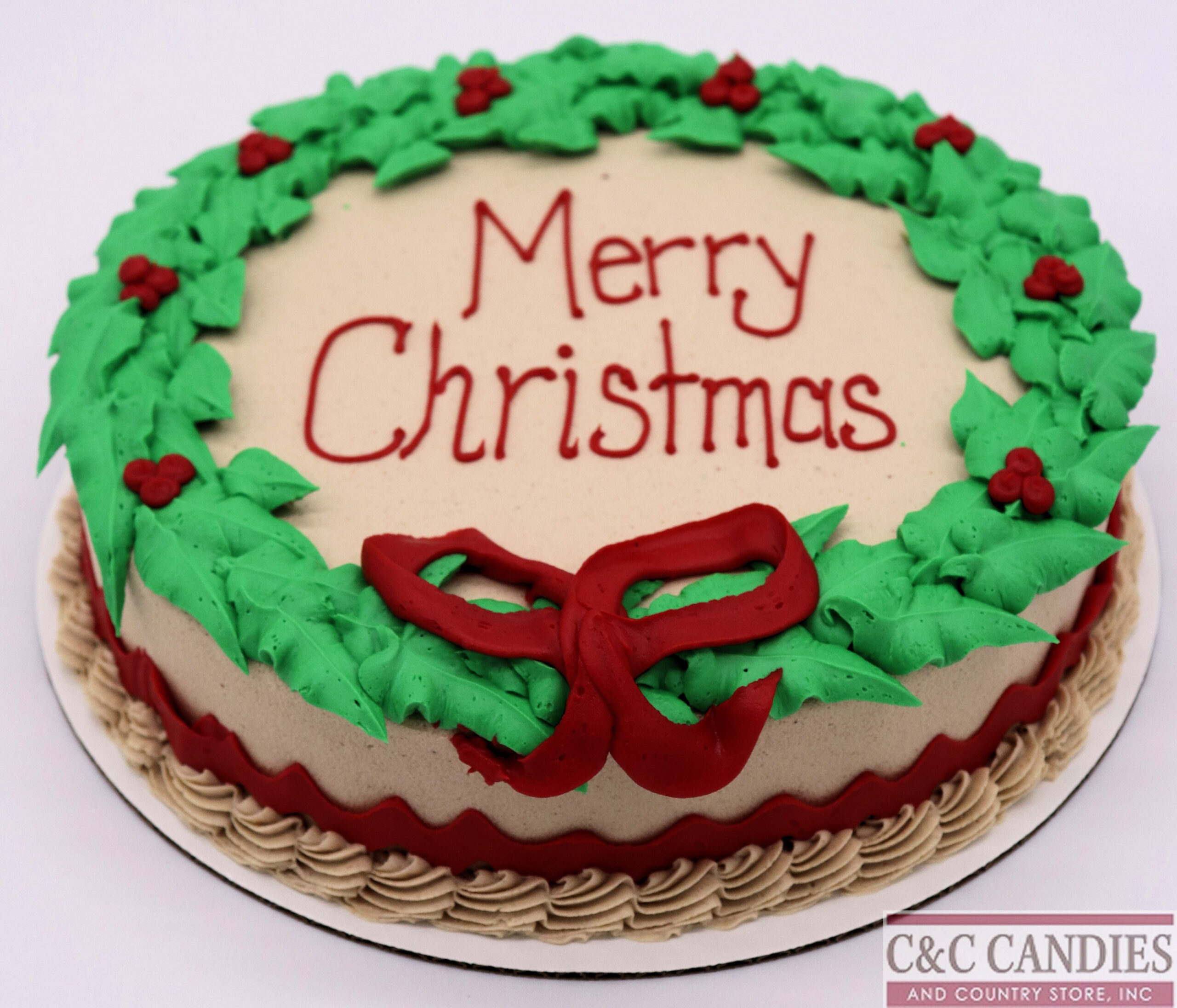 Celebrate the season with our beautifully festive Holiday Wreath Cake! This round cake features a piped holly leaf wreath with bright red berries and a classic red bow, creating a timeless holiday look. Shown in peanut butter icing, but available in your choice of icing flavor to suit your taste and style.