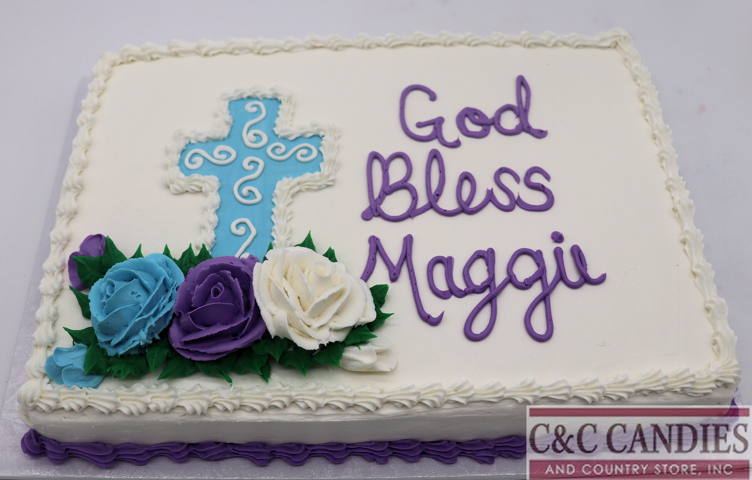 Celebrate a cherished spiritual moment with our Heavenly Blessings sheet cake. This elegant design features a hand-piped cross and floral accents, making it perfect for baptisms, first communions, confirmations, or any faith-based occasion. Customize your message and floral colors to match the event’s theme.