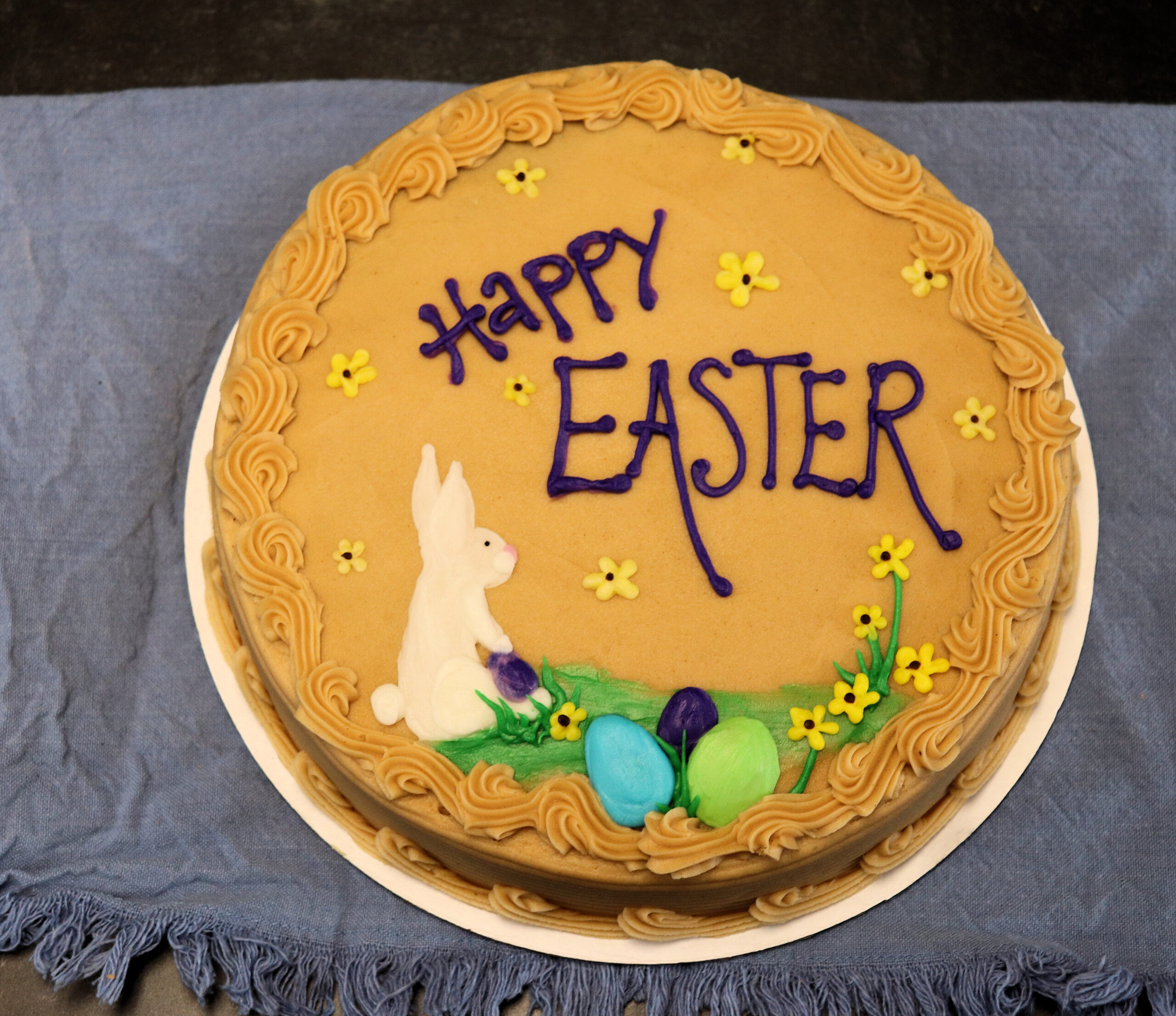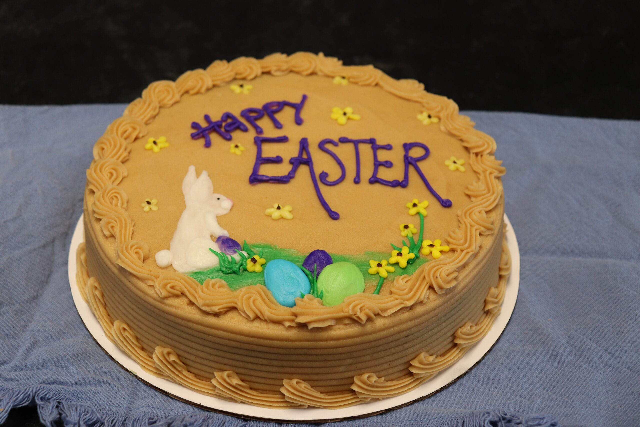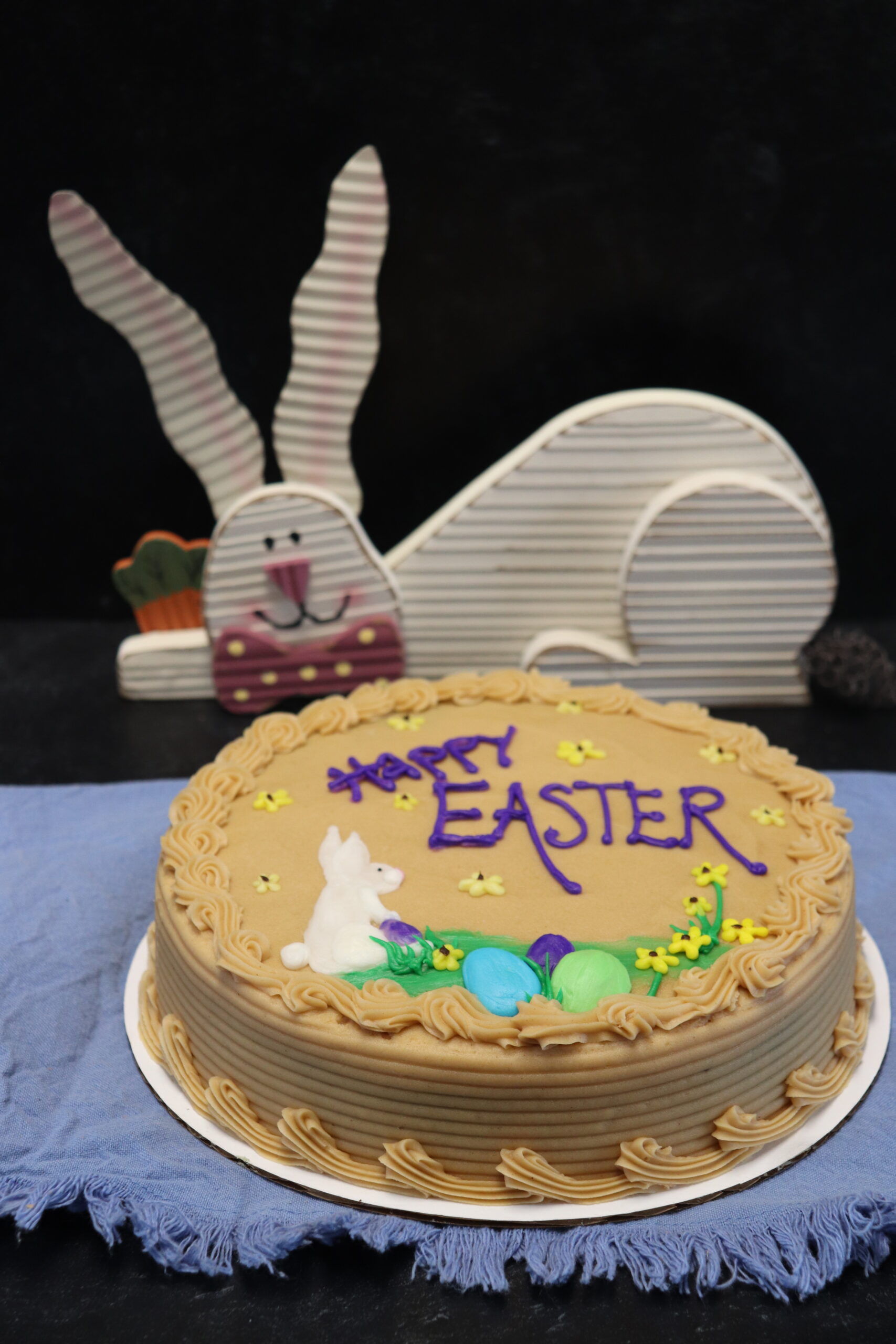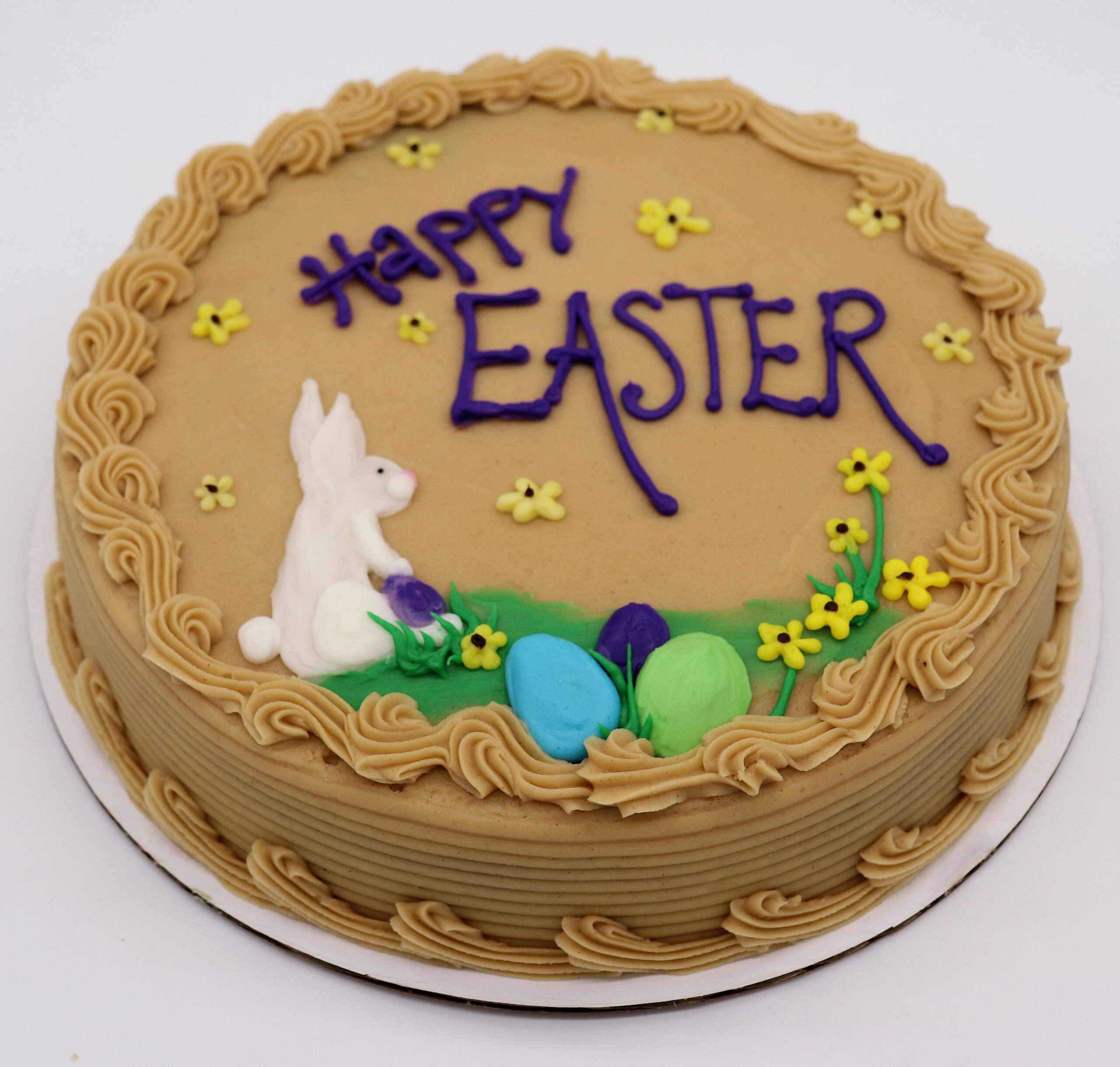 Each cake is decorated by hand, so flower placement, egg colors, and bunny details may vary slightly, making every cake unique. Available in your choice of cake flavors and icing options, this design works best in buttercream for the cleanest look and vibrant colors.